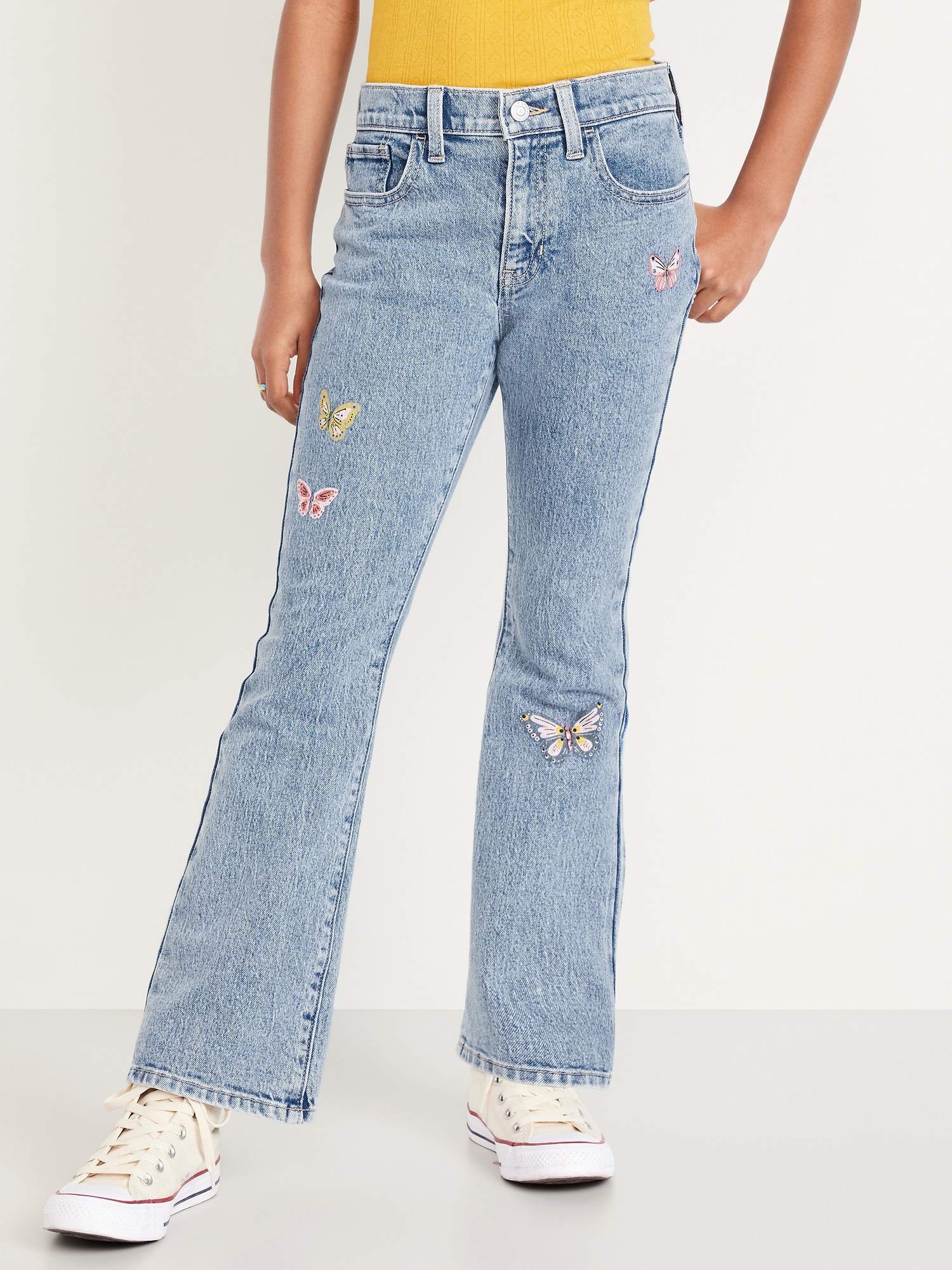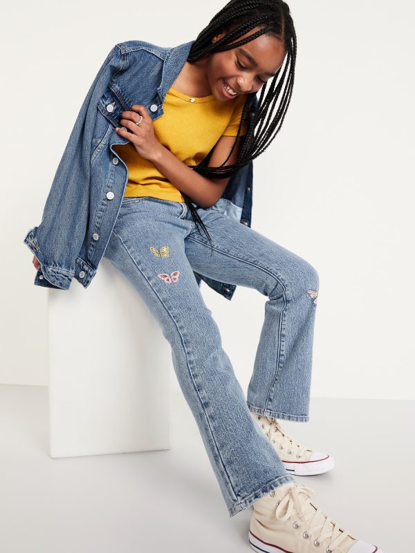 High-Waisted Embroidered Flare-Leg Jeans for Girls: The it fits she really, really wants.interior adjustable waistband, sizes 5-8 snap-button closure, sizes 10-20 regular button closure, zip fly, utility pockets at front, patch pockets at back, flared leg, #855058