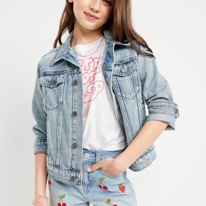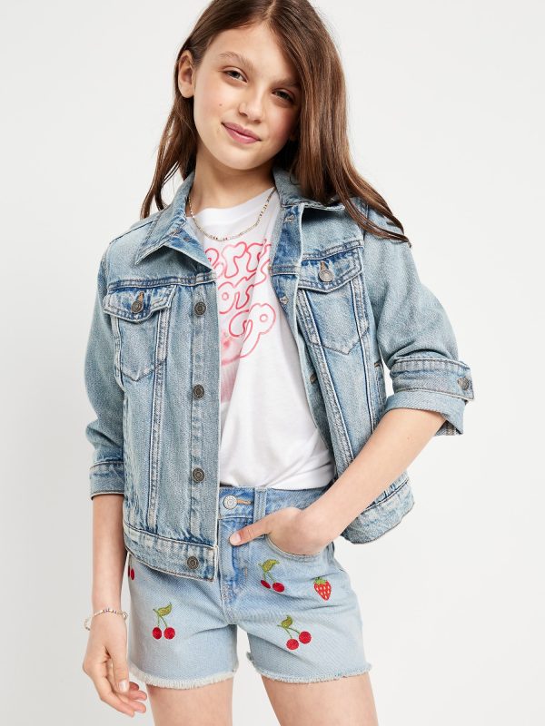 High-Waisted Embroidered Frayed-Hem Jean Shorts for Girls: interior adjustable waistband, sizes 5-8 snap-button closure, sizes 10-20 regular button closure, zip fly, scoop pockets and coin pocket in front, patch pockets in back, rips/tears at front for a lived-in look, frayed hem, #855327