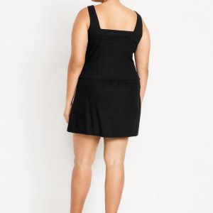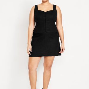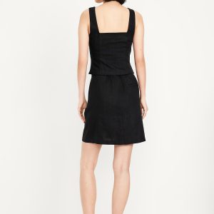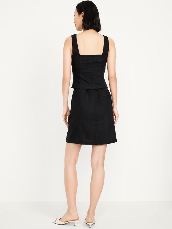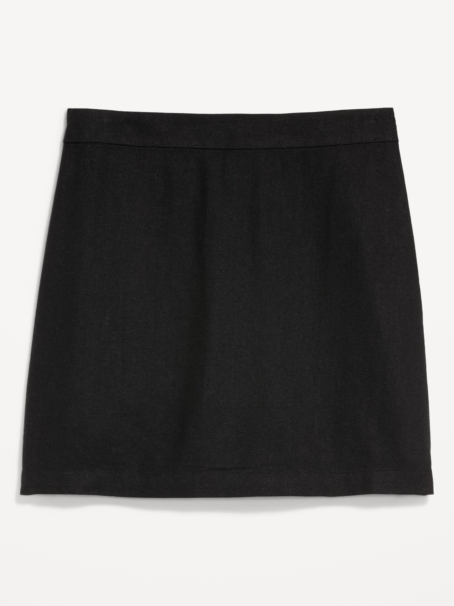 High-Waisted Linen-Blend Mini Skirt: elasticized back waist, hidden left seam zipper, back right welt pocket, pull-on style, vertical striped print, #705375