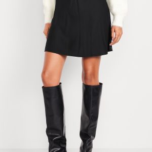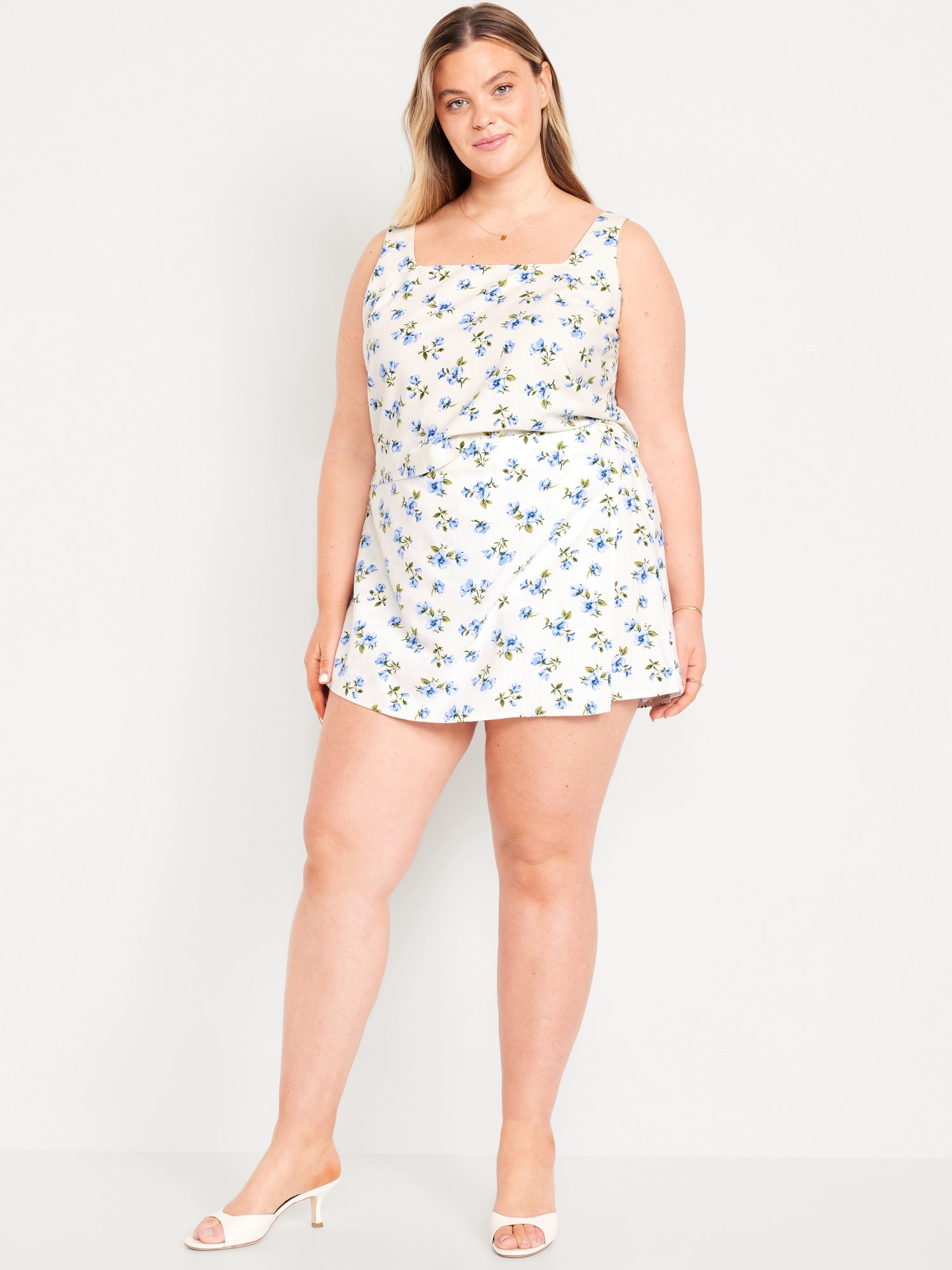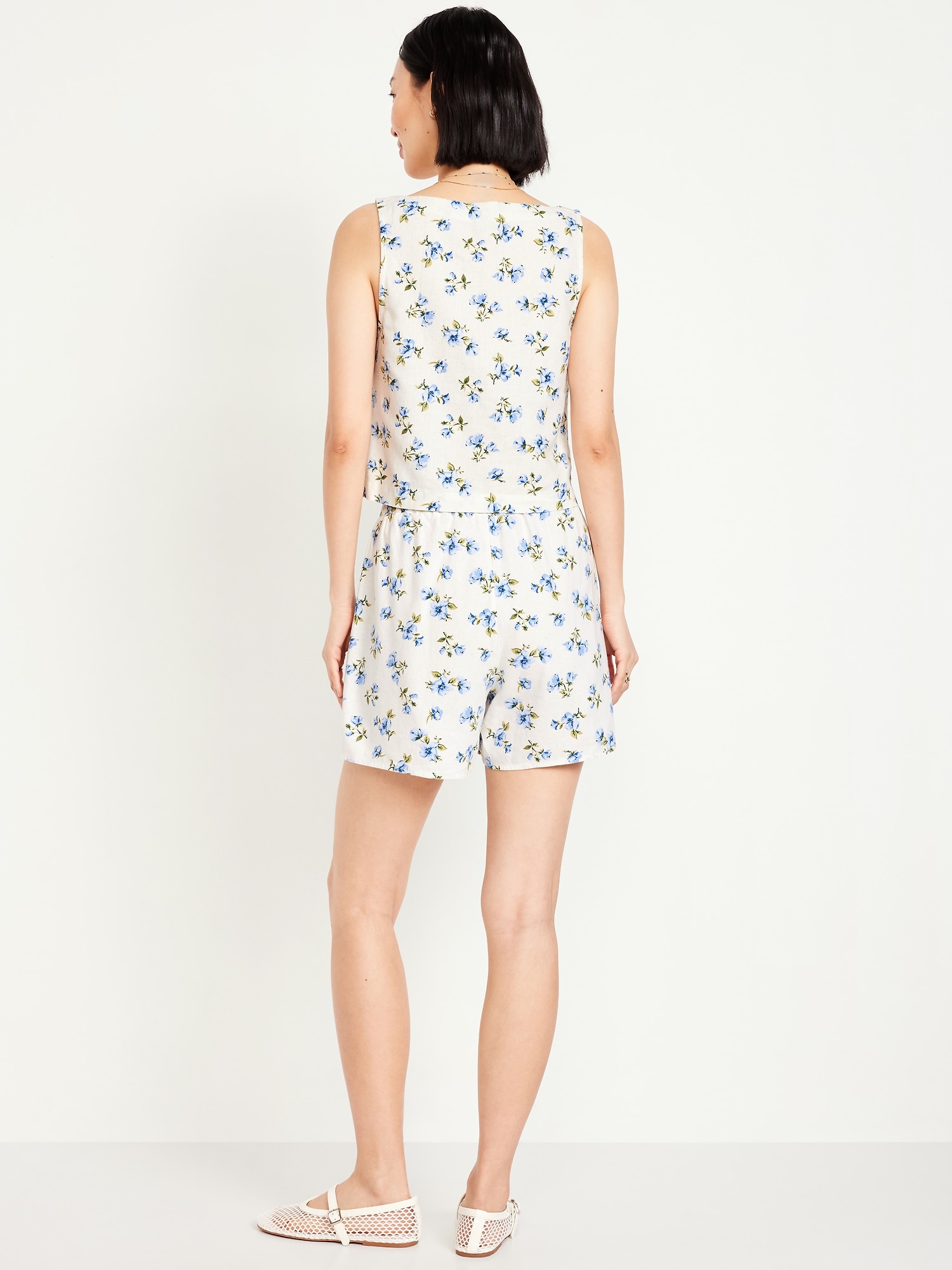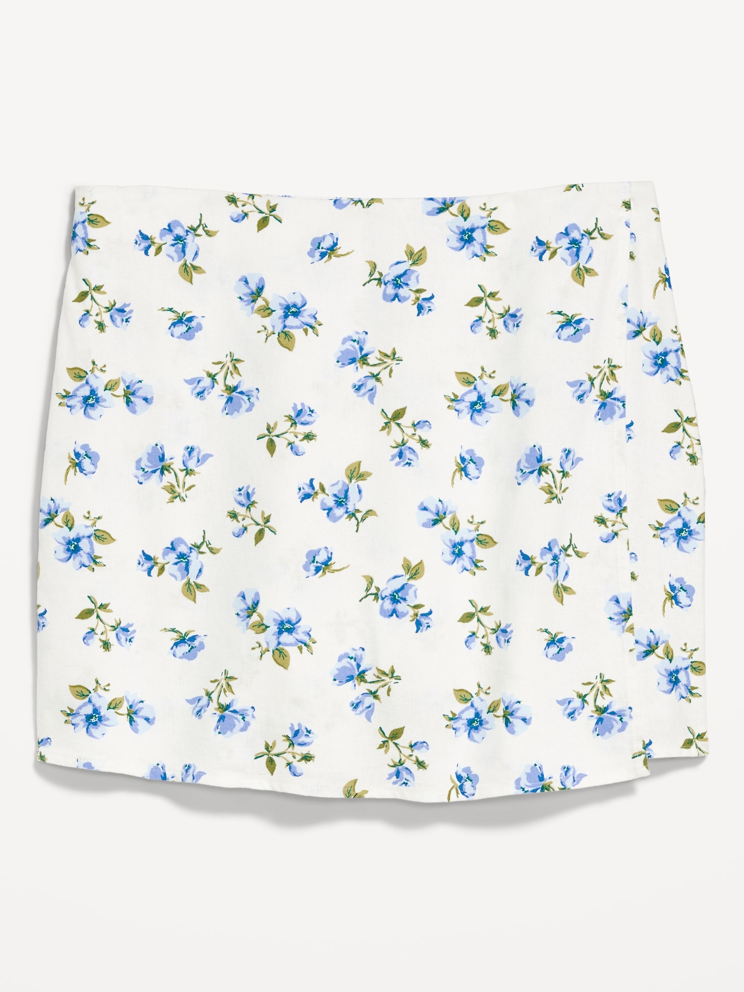 High-Waisted Linen-Blend Mini Skort: faux-wrap front, elastic back waist, built-in shorts, #766917