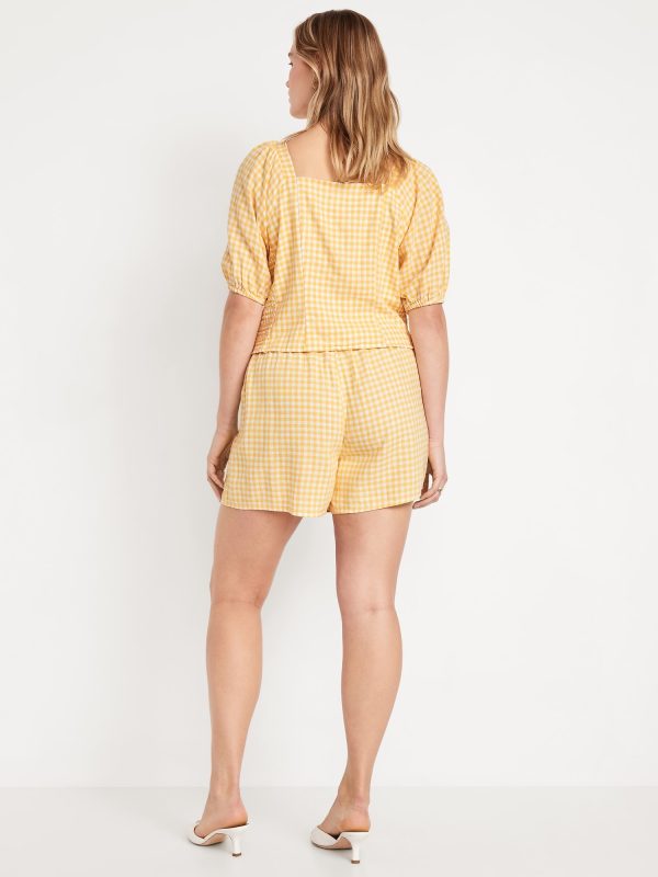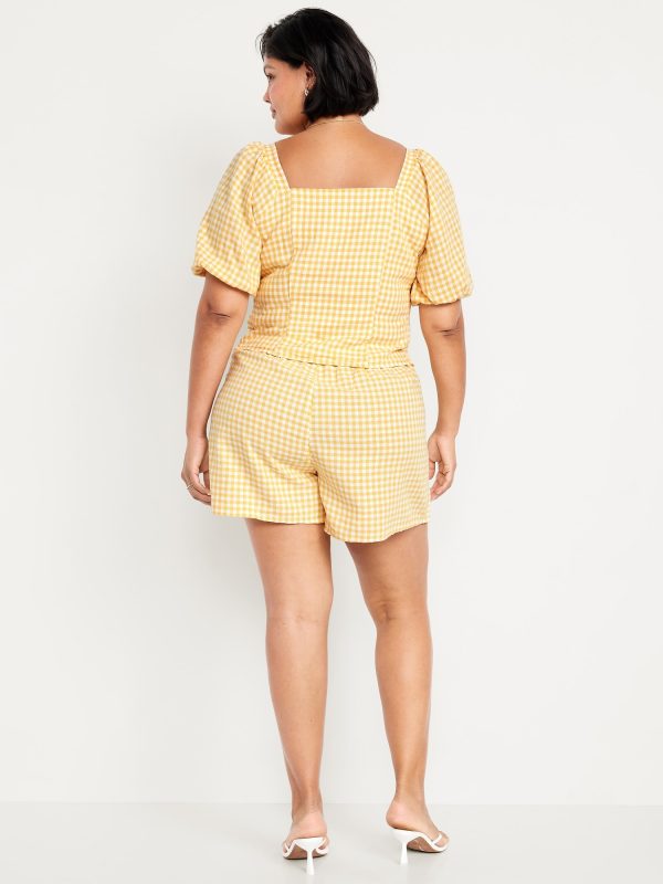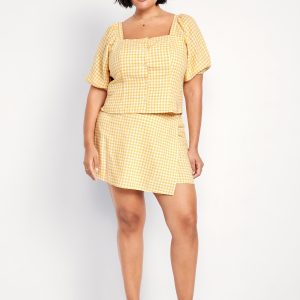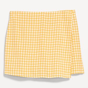High-Waisted Linen-Blend Mini Wrap Skort: faux-wrap front, elastic back waist, built-in shorts, #766917
