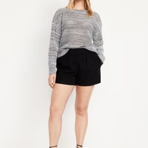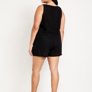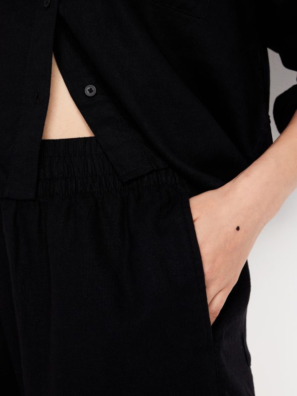 High-Waisted Linen-Blend Shorts — 3.5-inch inseam: comfort elastic waistband, on-seam hip pockets, back patch pockets, easy pull-on style, #693453