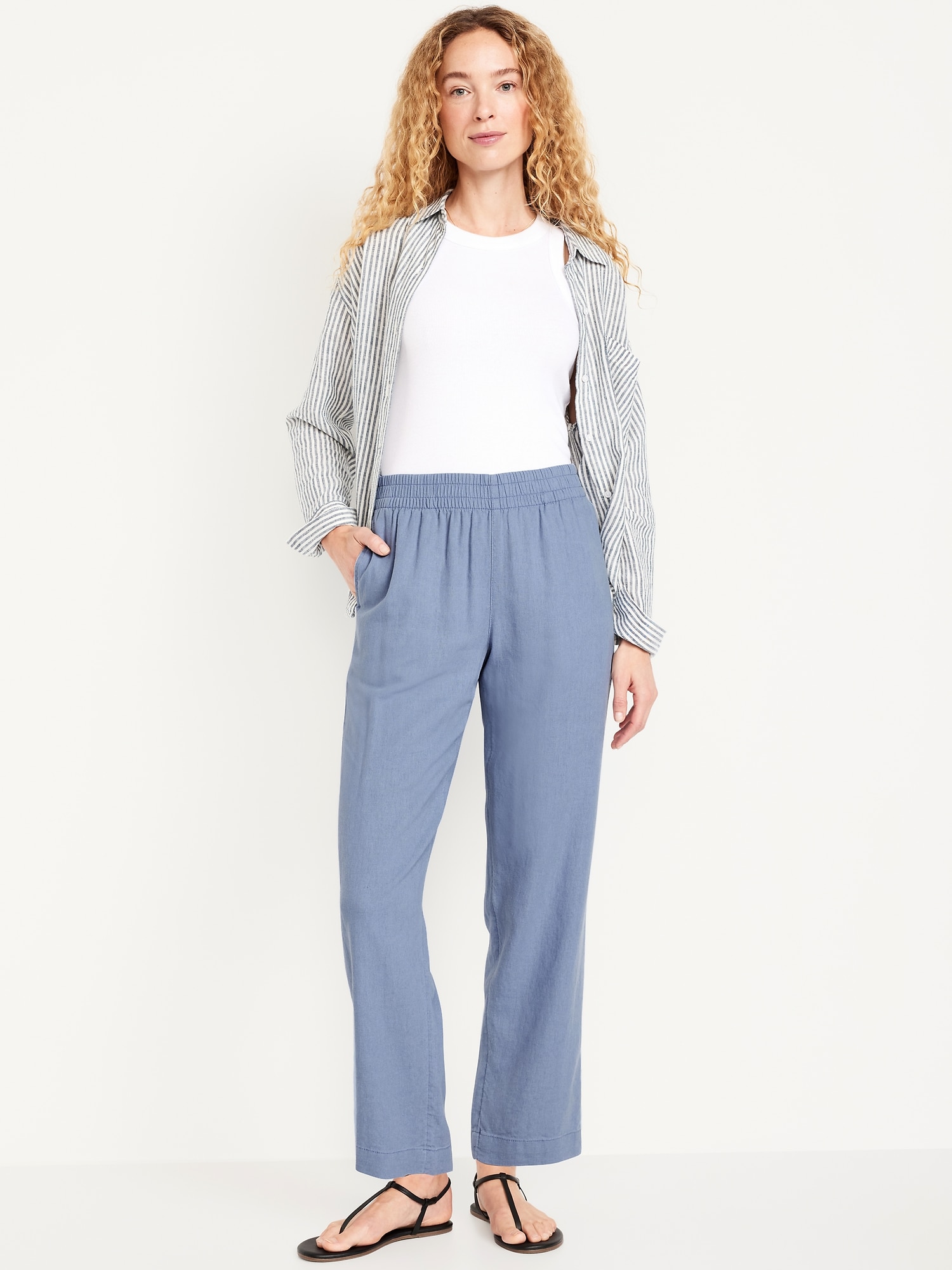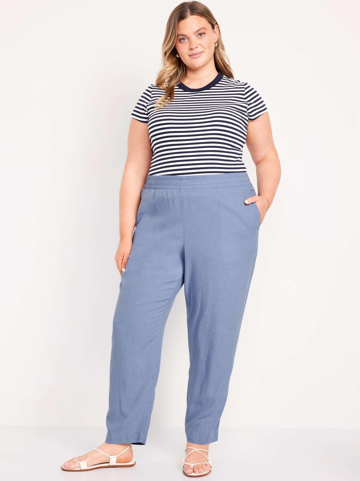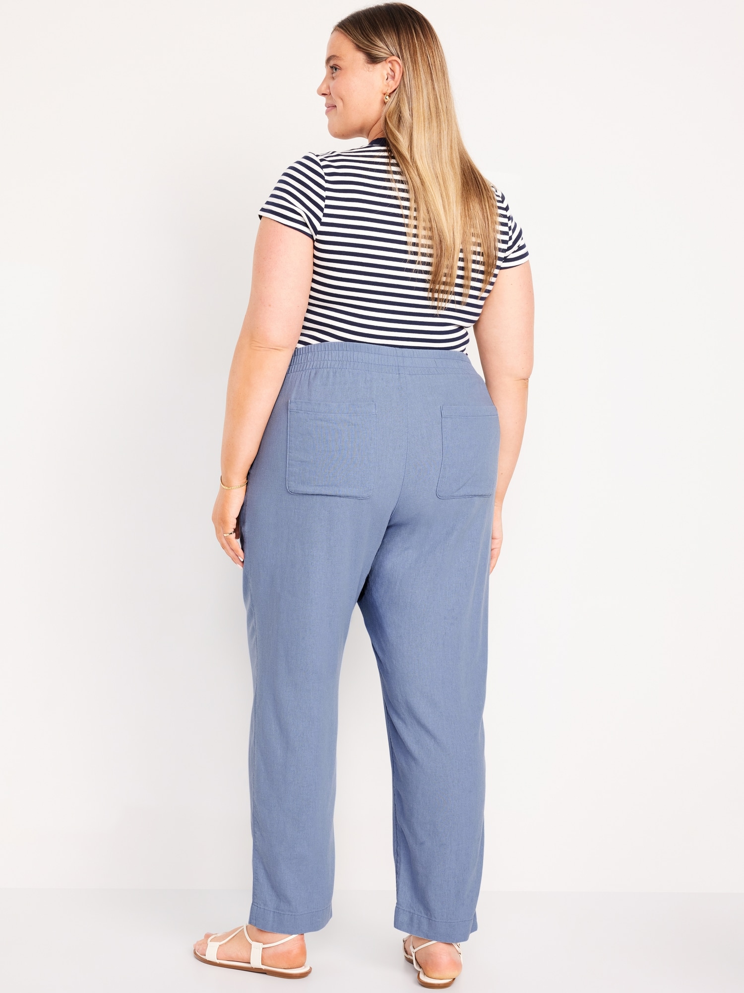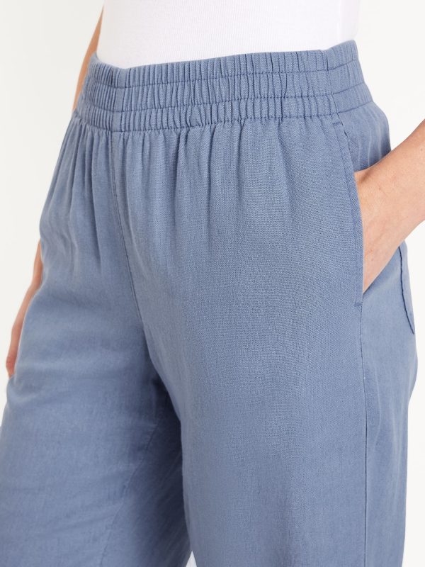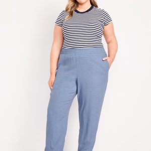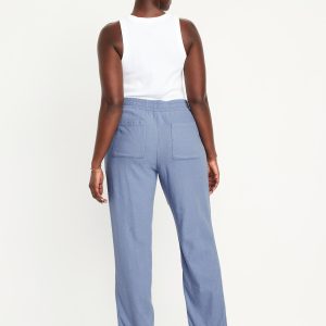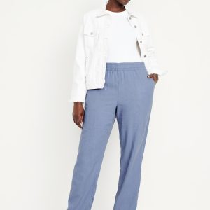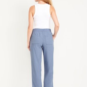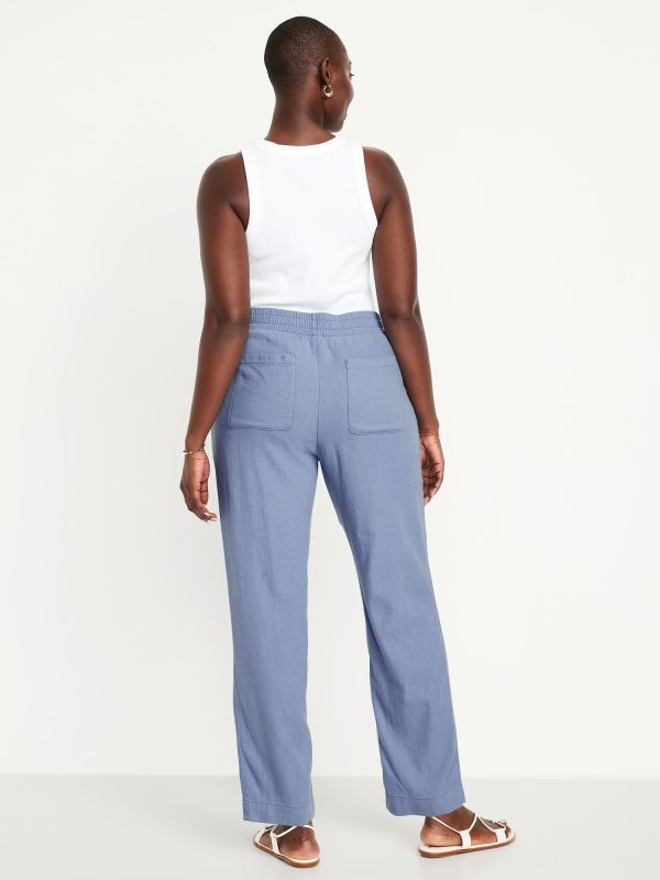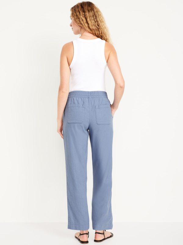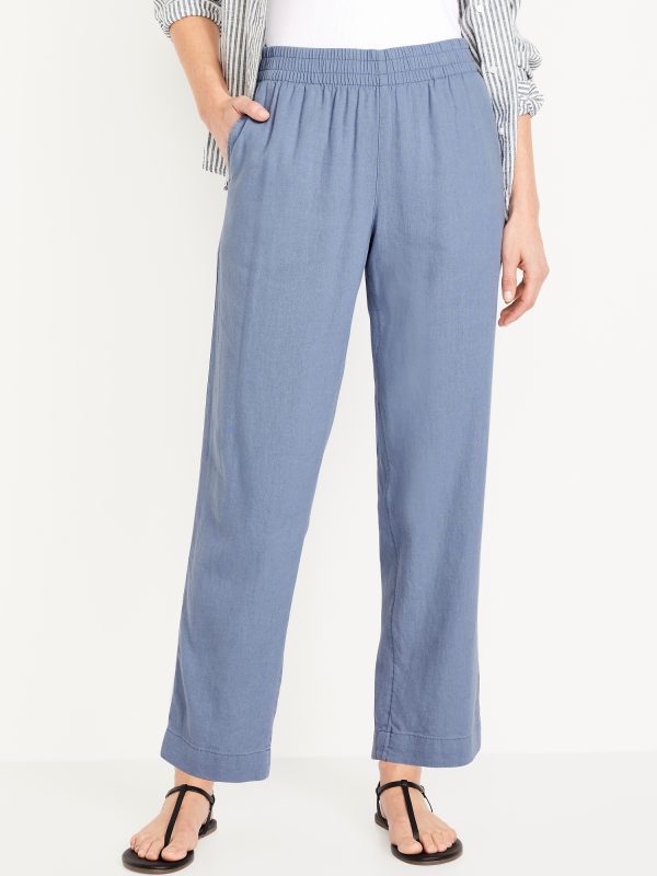 High-Waisted Linen-Blend Straight Ankle Pants: elasticized waistband, on-seam hip pockets, back patch pockets, straight leg, pull-on style, #683297