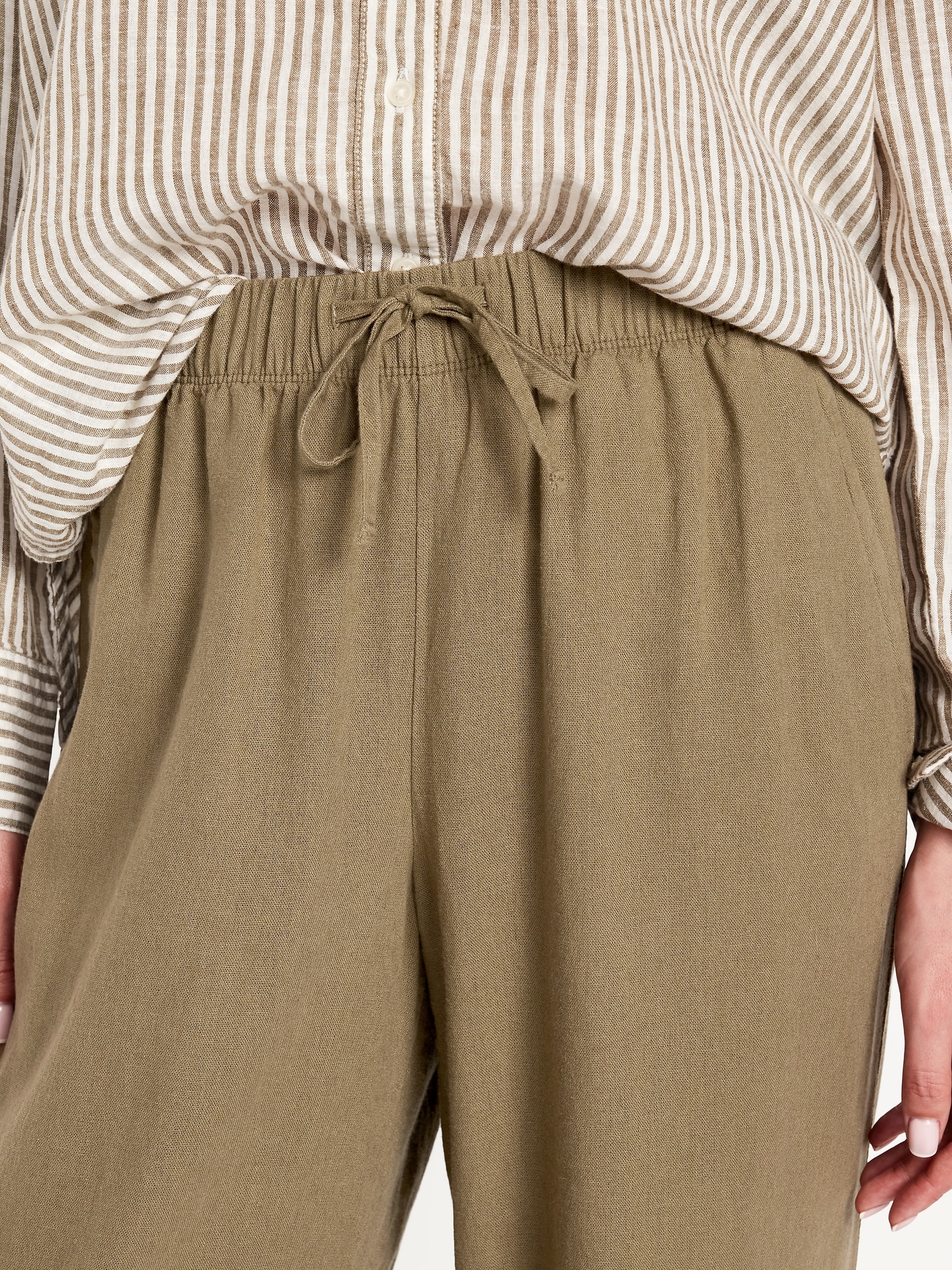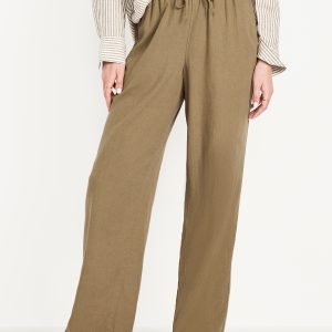 High-Waisted Linen-Blend Straight Pants: comfort elastic-drawstring waistband, side-seam pockets, back patch pockets, straight leg, easy pull-on style, #784300