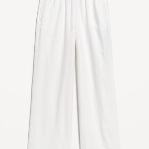 High-Waisted Linen-Blend Wide-Leg Pants: comfort elastic-drawstring waist, side-seam pockets, wide leg, vertical striped print, pull-on style, #766295