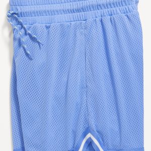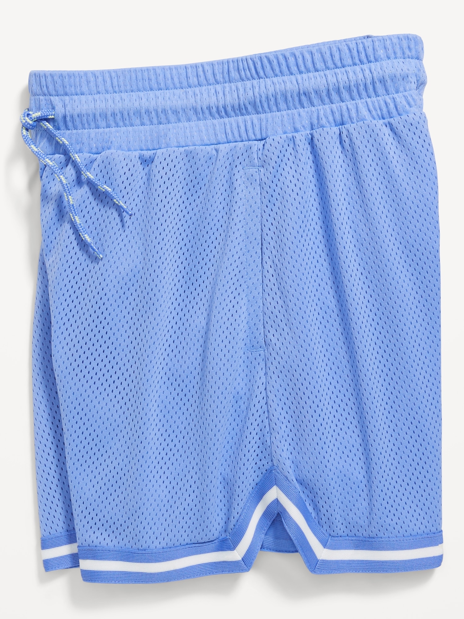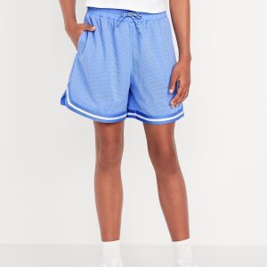 High-Waisted Mesh Basketball Shorts for Girls: high rise, elasticized waistband, adjustable drawstring, on-seam side pockets, retro striped tape trim at leg openings, vented sides, #696474