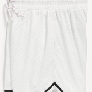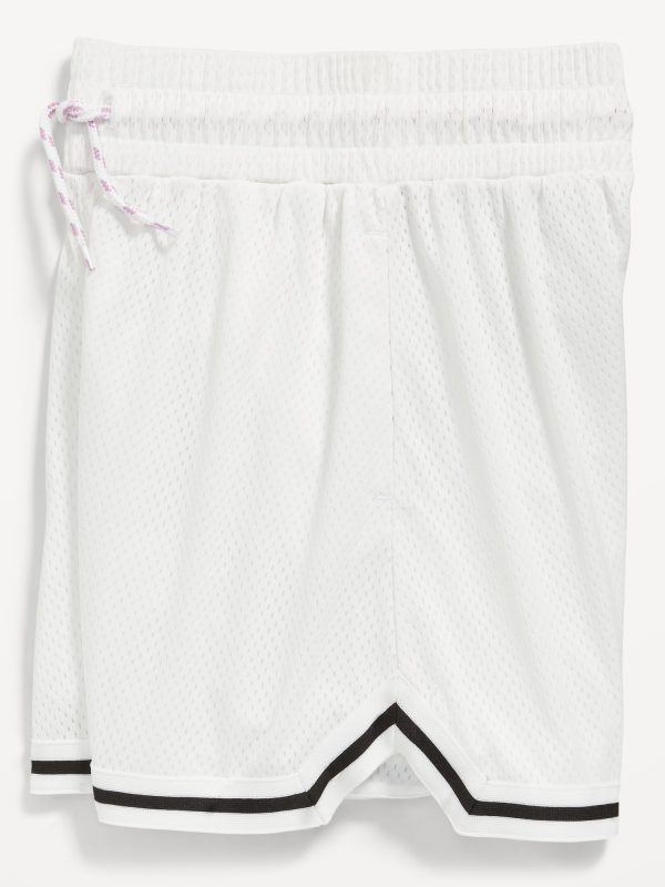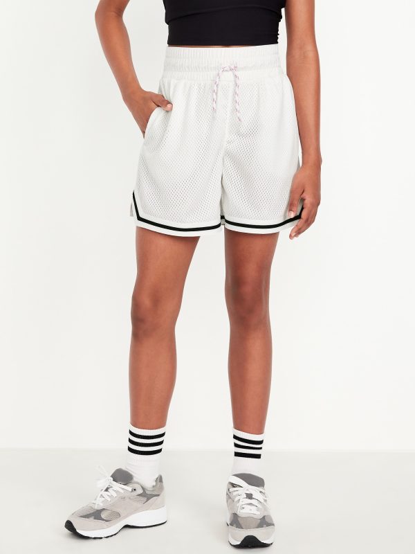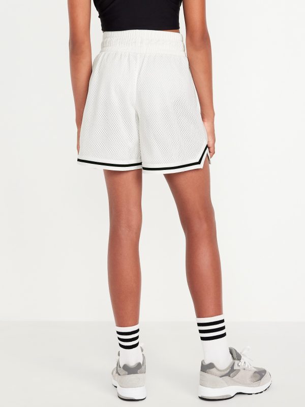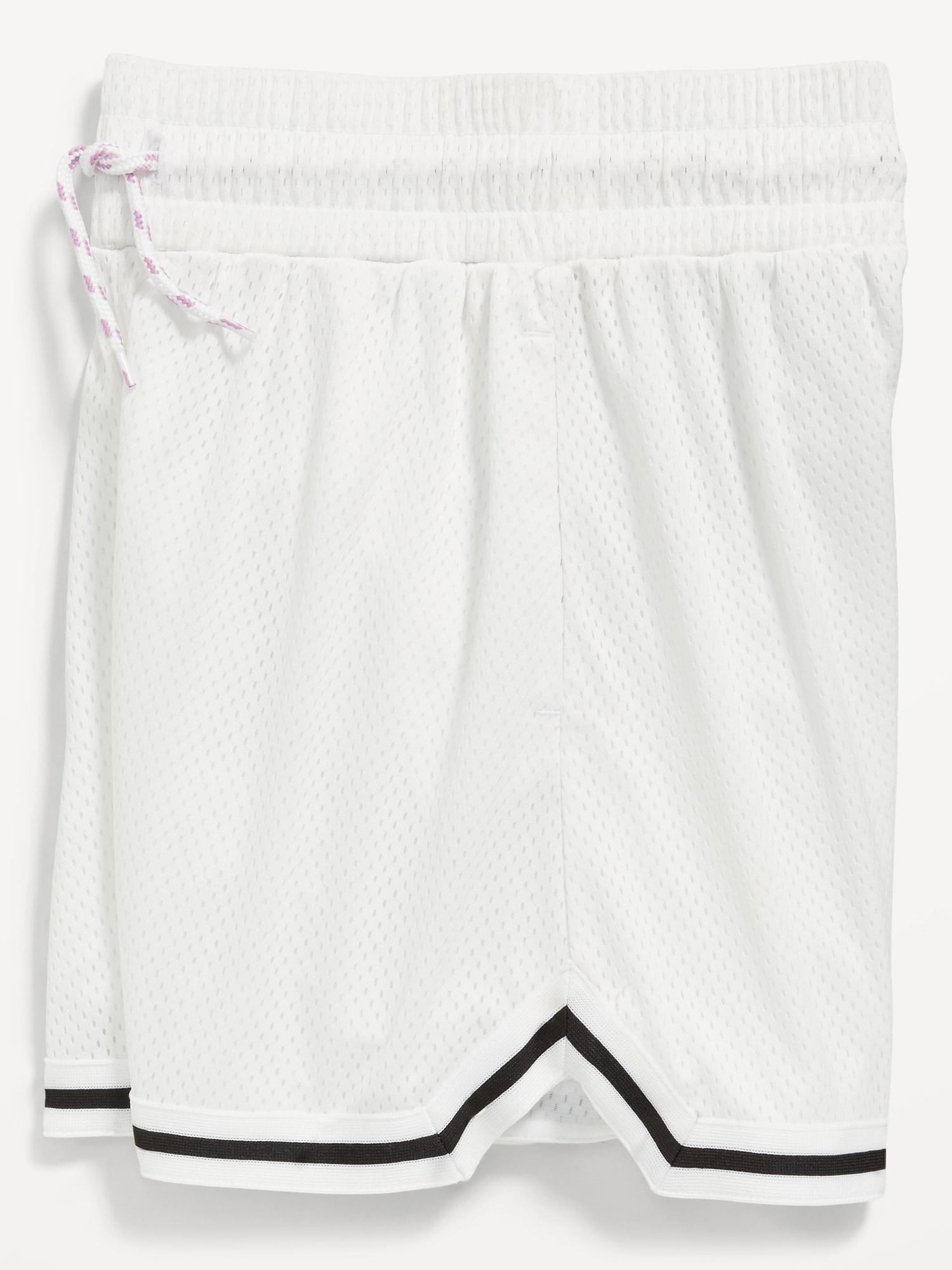 High-Waisted Mesh Basketball Shorts for Girls: high rise, elasticized waistband, adjustable drawstring, on-seam side pockets, retro striped tape trim at leg openings, vented sides, #696474