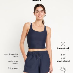 High-Waisted PowerSoft Shorts — 3.5-inch inseam: Featuring PowerSoft. Light compression meets a peachy-smooth, sweat-wicking fabric.elastic-drawstring waistband, diagonal hip pockets, go-dry wicks moisture, breathable, easy pull-on style, #694167
