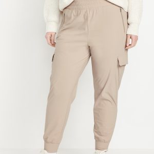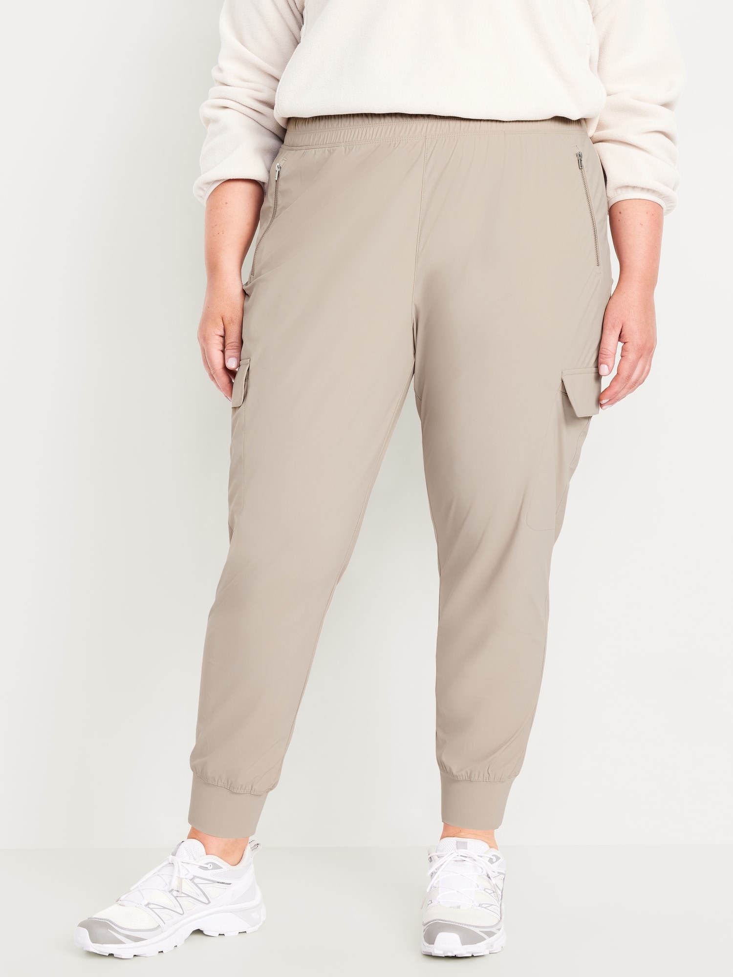High-Waisted SleekTech Cargo Joggers: Featuring SleekTech. Polished and lightweight, with serious stretch.elastic waist, zippered hip pockets, flap-cargo pockets at thigh, go-dry wicks moisture, breathable, pull-on style, #569700