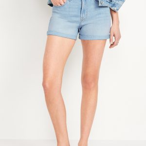 High-Waisted Wow Jean Shorts — 3-inch inseam: button front, belt loops, zip fly, front scoop pockets, back patch pockets, cuffed hem, #890124