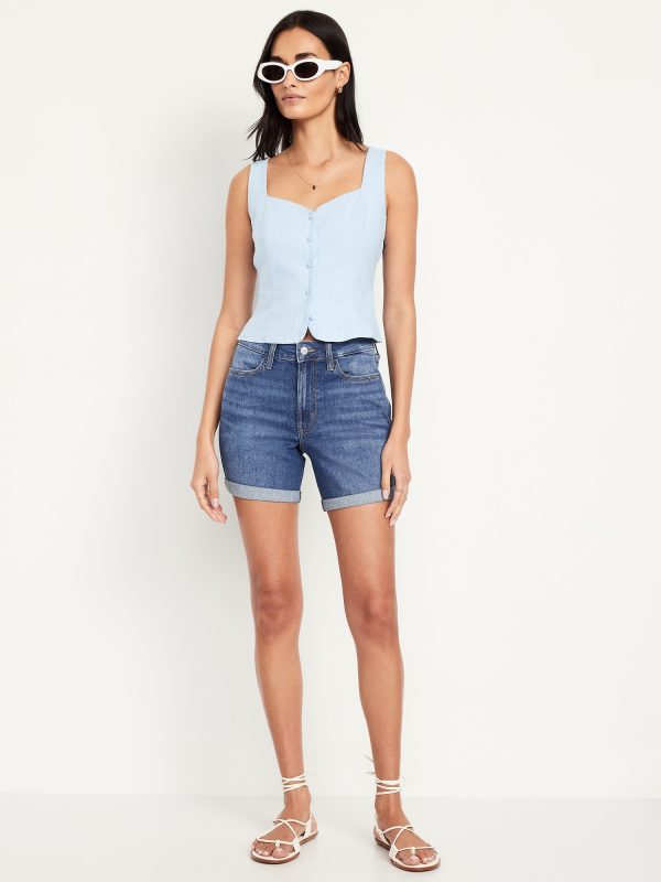 High-Waisted Wow Jean Shorts — 5-inch inseam: button front, zip fly, zip fly, front scoop pockets, back patch pockets, cuffed hem, #849408