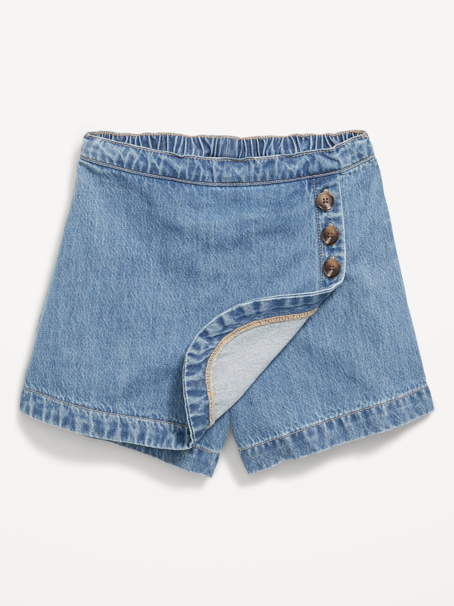 High-Waisted Wrap-Front Jean Skort for Girls: built-in shorts, elasticized back waist, decorative three-button front, easy pull-on style, #766700