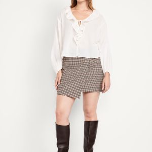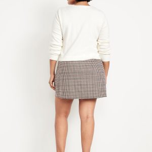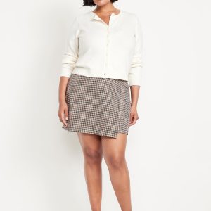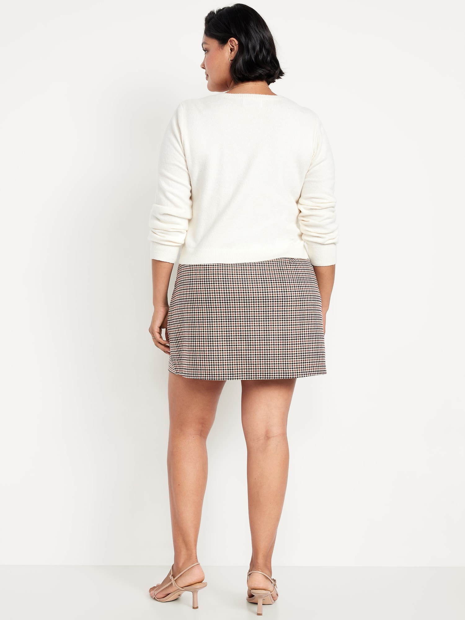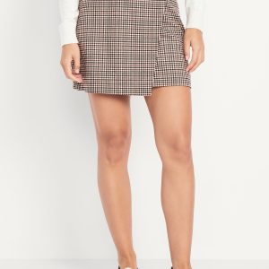 High-Waisted Wrap-Front Mini Skirt: wrap front, left side zipper, darted back, plaid print, #804477