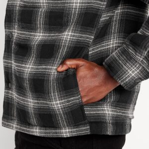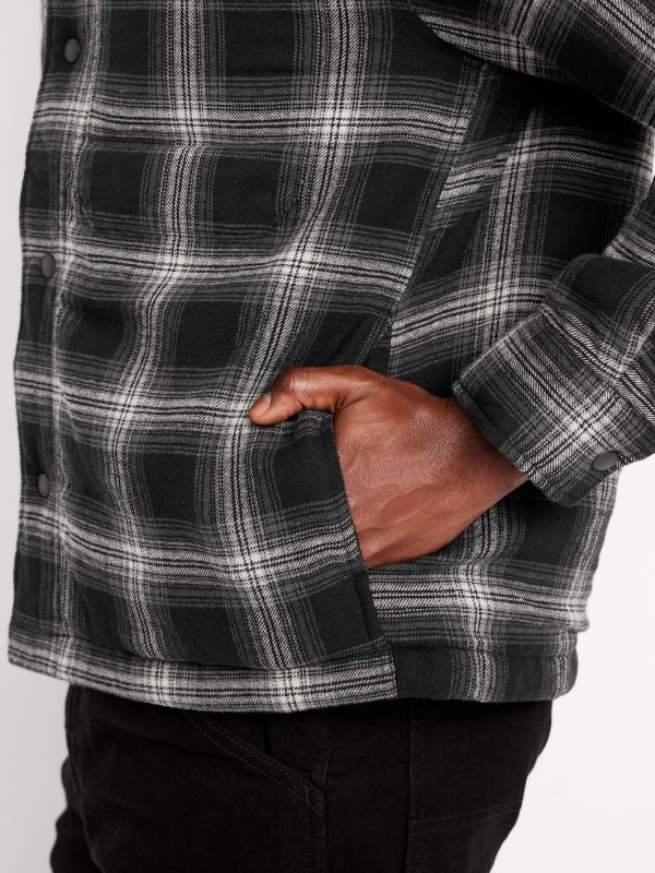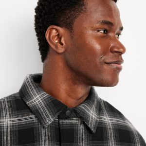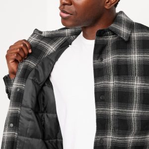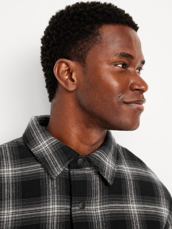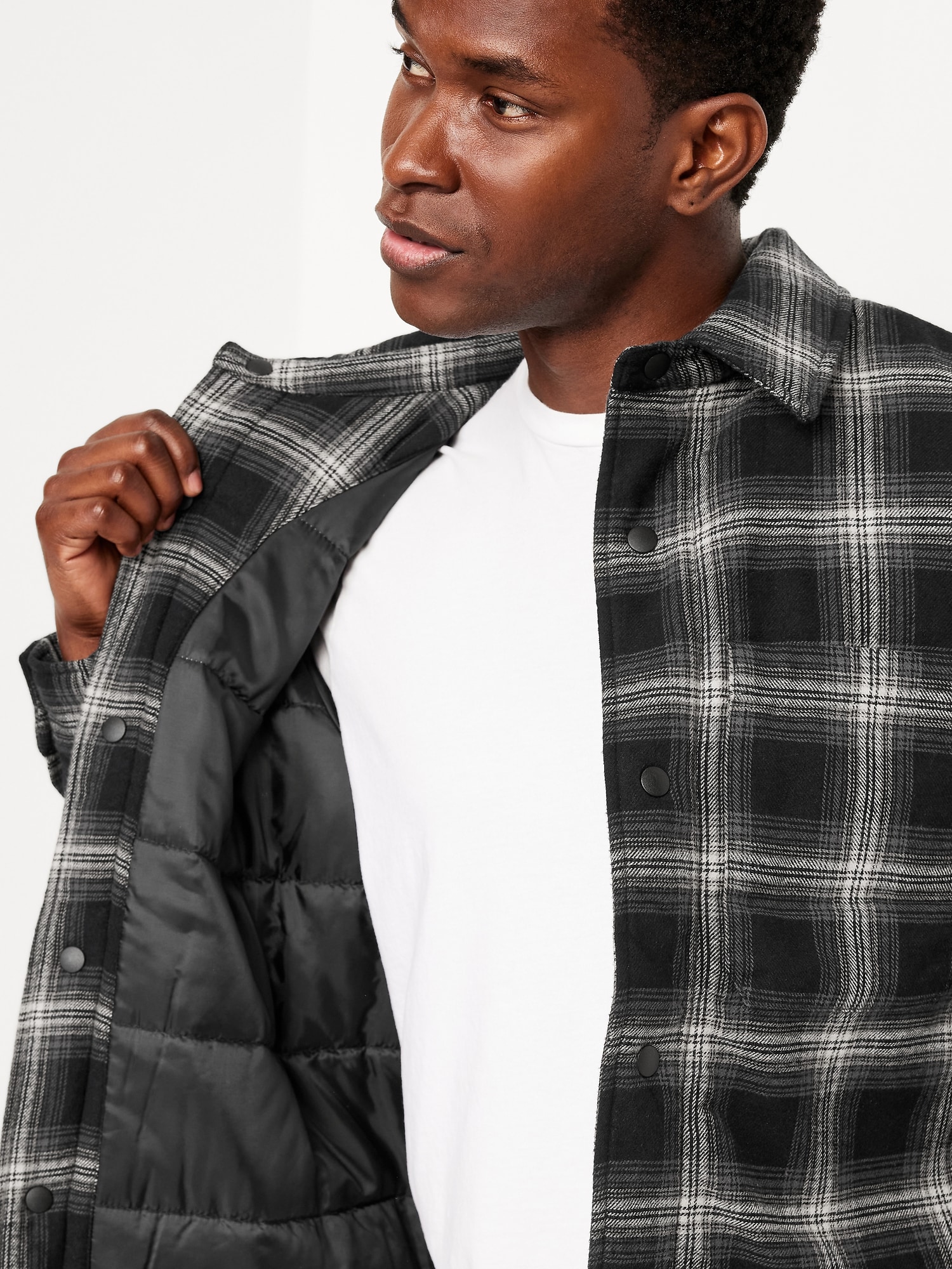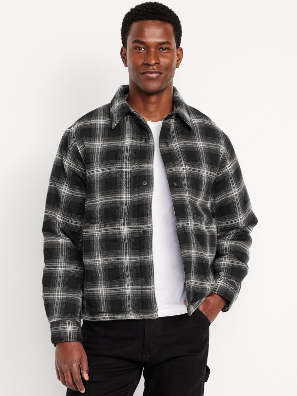 Insulated Cropped Flannel Shacket: spread collar, long sleeves with snap cuffs, full-snap front, patch chest pockets, plaid print, #800296