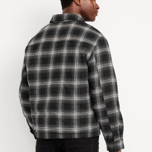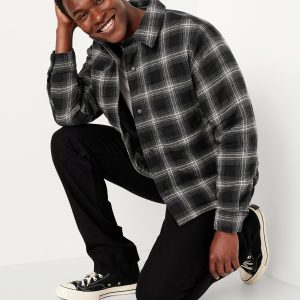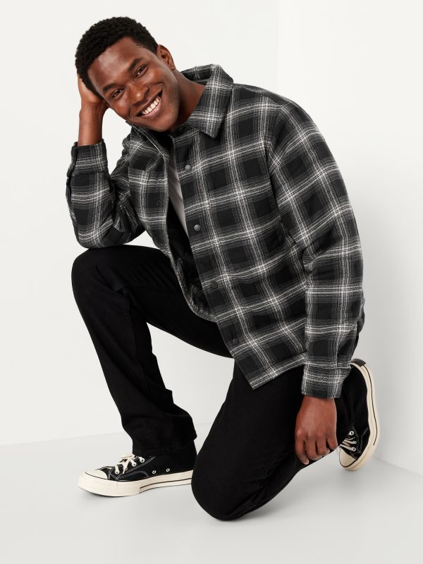 Insulated Cropped Flannel Shacket: spread collar, long sleeves with snap cuffs, full-snap front, patch chest pockets, plaid print, #800296