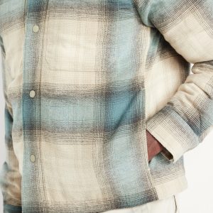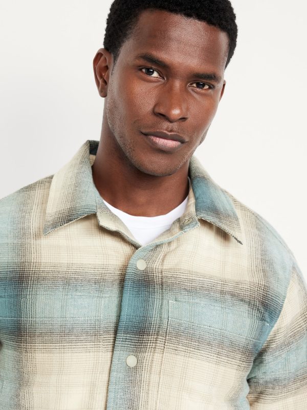 Insulated Cropped Flannel Shacket: spread collar, long sleeves with snap cuffs, full-snap front, patch chest pockets, plaid print, #800296
