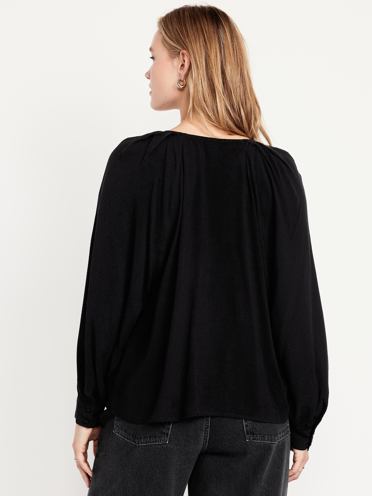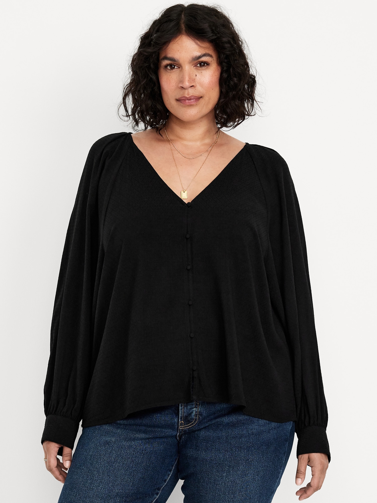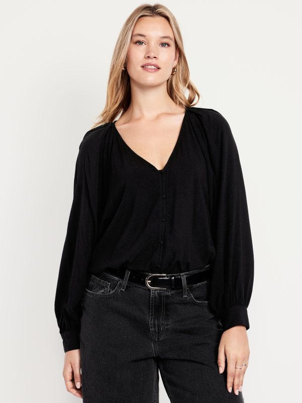 Jacquard Button-Down Top: v-neck, raglan sleeves with buttoned cuffs, full-button front, prints vary, #805742