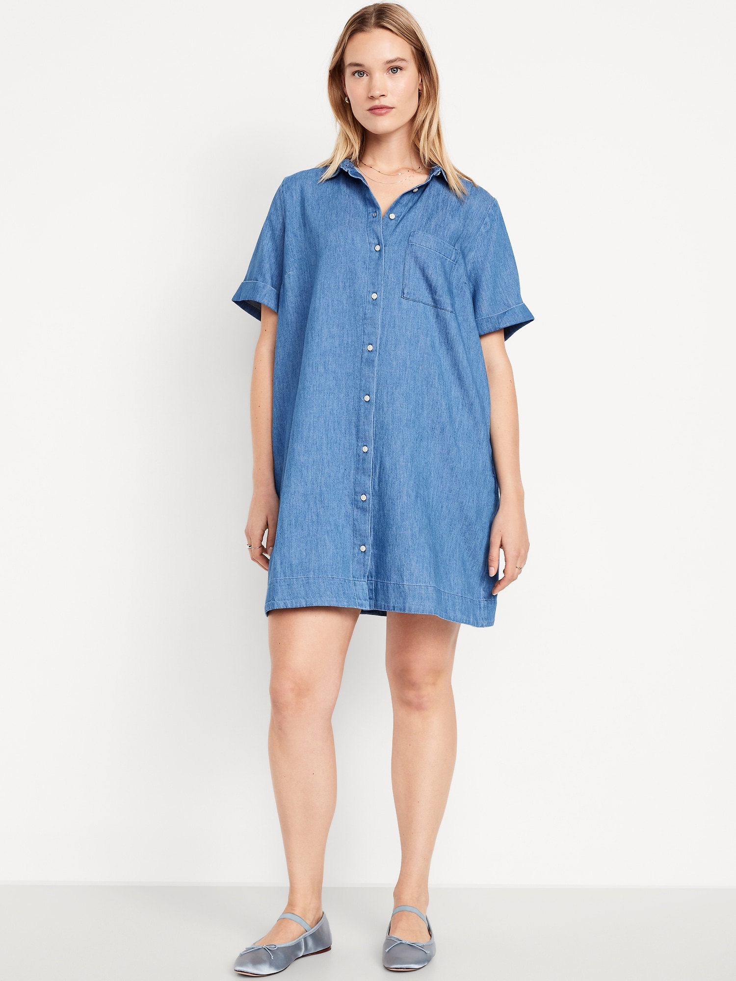 Jean Shirt Dress: spread collar, short sleeves, side-seam pockets, patch chest pocket, full-button front, #705355