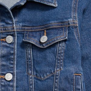 Jean Trucker Jacket for Girls: notched collar, long sleeves, seamed yoke, button-flap pockets at chest, full-length buttoned placket, vertical welt pockets, #424029