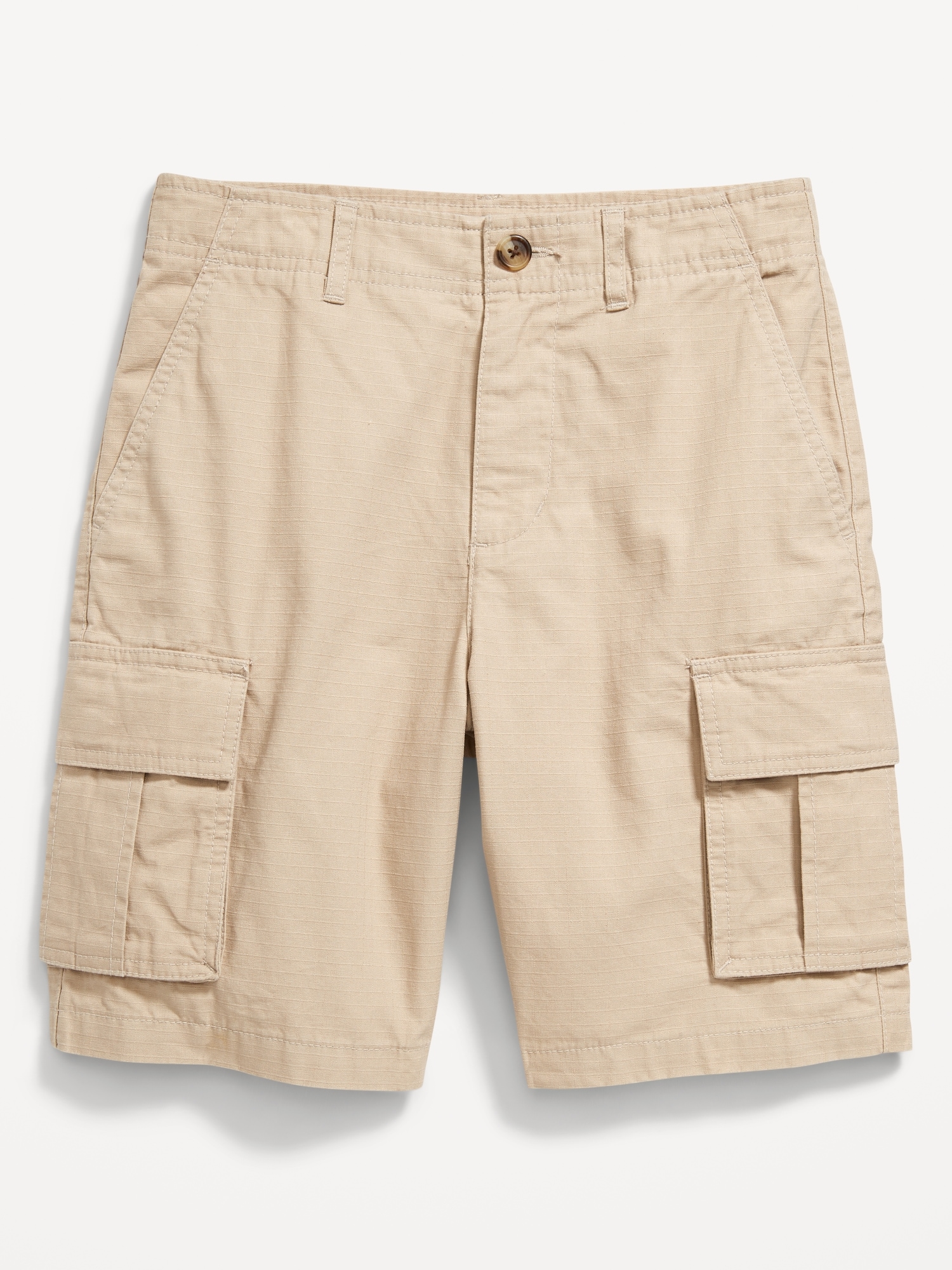 Knee Length Cargo Ripstop Shorts for Boys: interior adjustable waistband, button closure, zip fly, diagonal on-seam pockets, snap-button cargo pockets at each leg, single patch pocket at back, all-over print or solid color, #681416