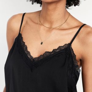 Lace-Trim Satin Cami Top: lace-trim v-neck, adjustable spaghetti straps, darted bust, #798427