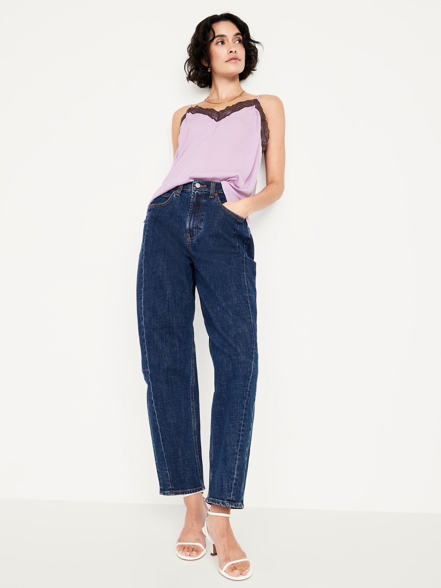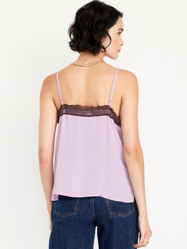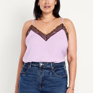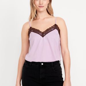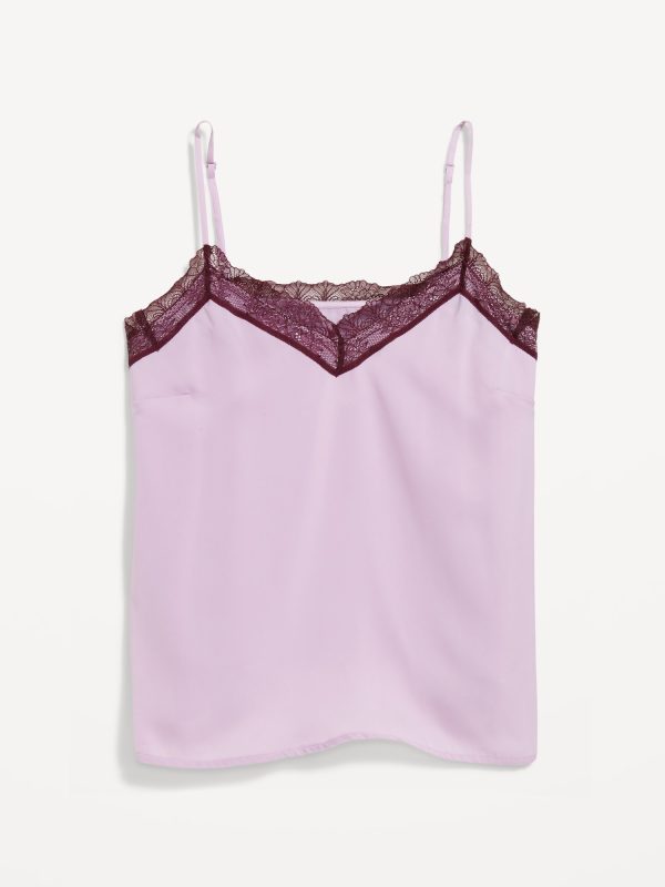 Lace-Trim Satin Cami Top: lace-trim v-neck, adjustable spaghetti straps, darted bust, #798427
