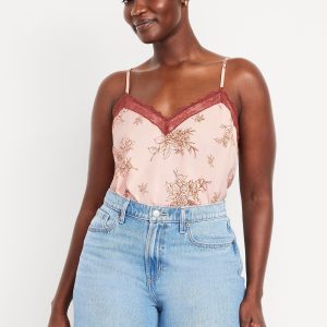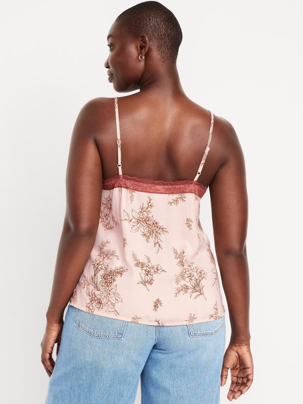 Lace-Trim Satin Cami Top: lace-trim v-neck, adjustable spaghetti straps, darted bust, #798427