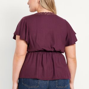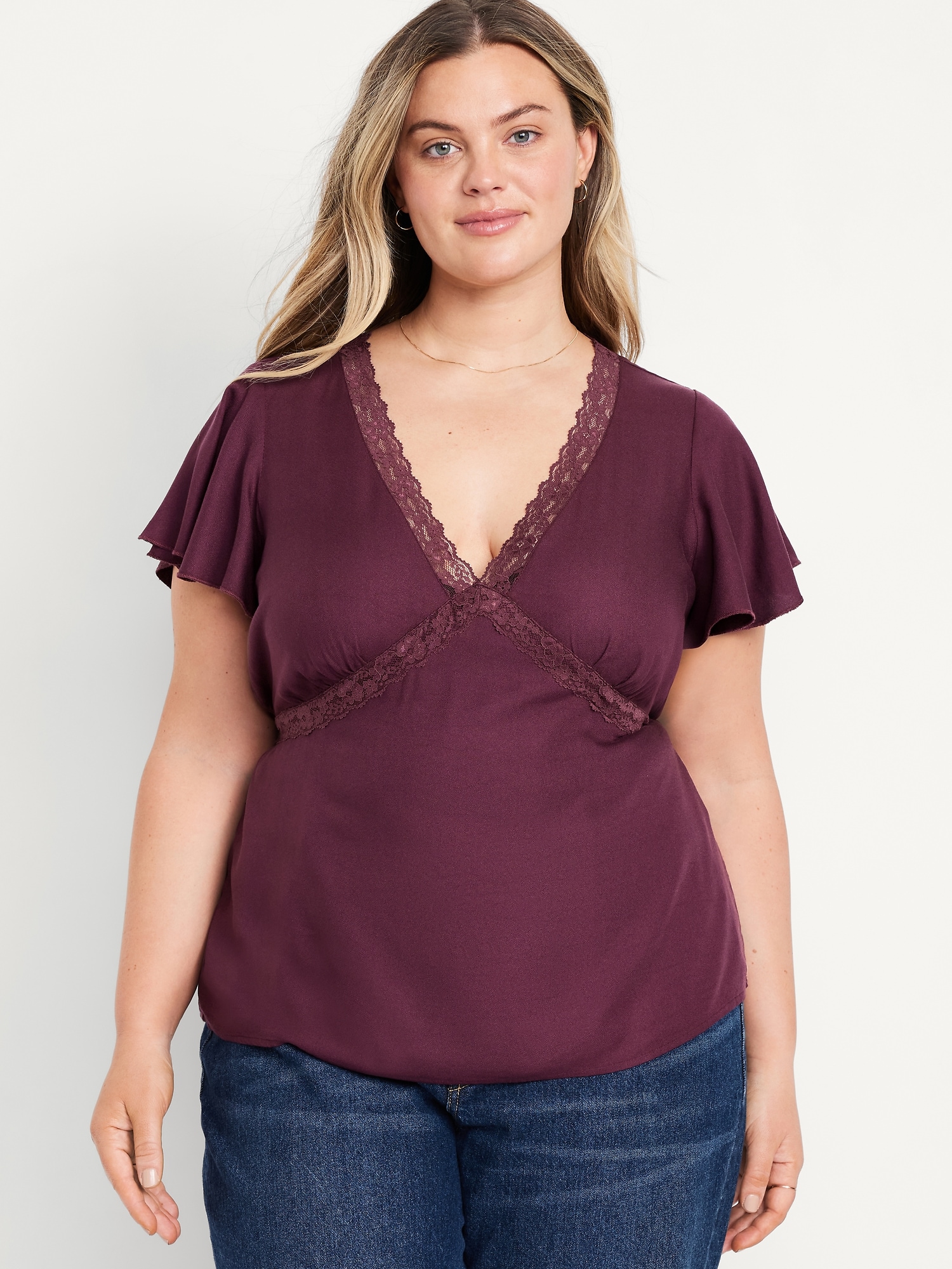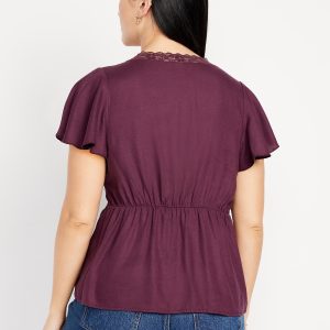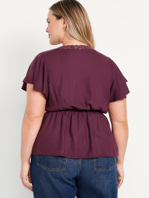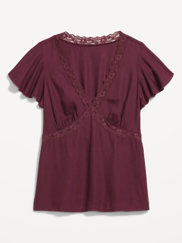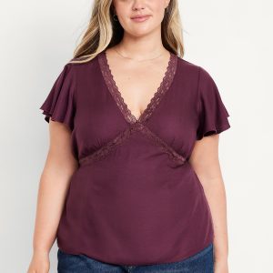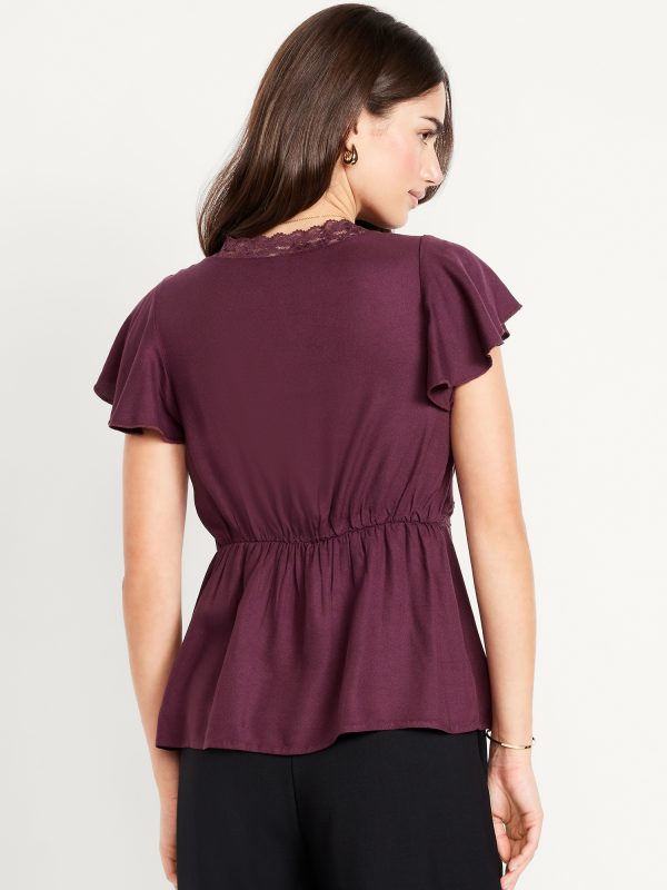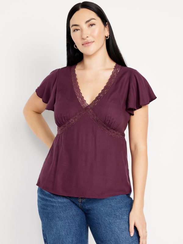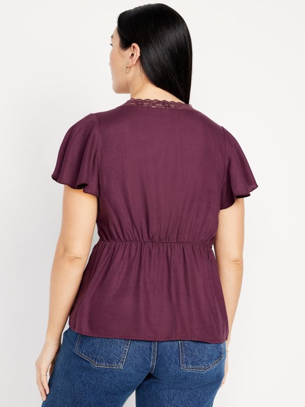 Lace-Trim V-Neck Crepe Top: lace-trim v-neck and bodice, short flutter sleeves, elastic back waist, shirred detail, #798558