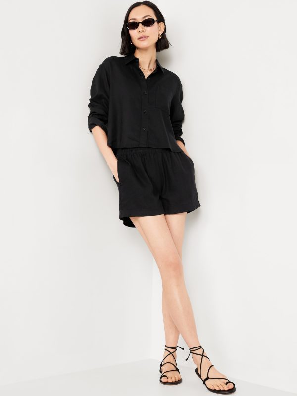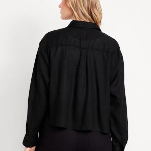 Linen-Blend Button-Down Crop Shirt: spread collar, long sleeves, buttoned cuffs, full-button front, patch chest pocket, #760758