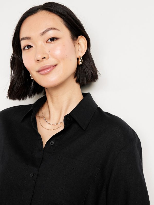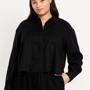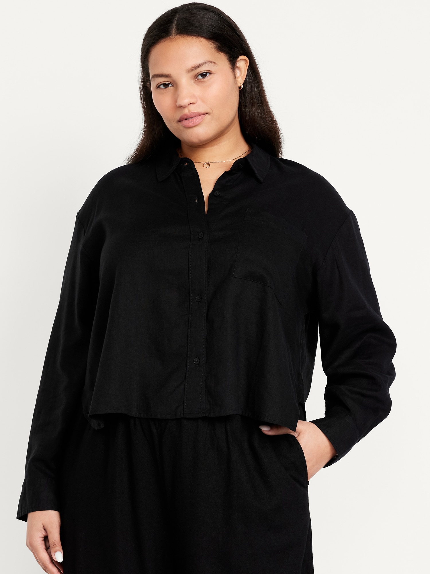 Linen-Blend Button-Down Crop Shirt: spread collar, long sleeves, buttoned cuffs, full-button front, patch chest pocket, #760758