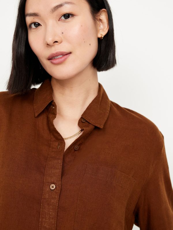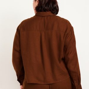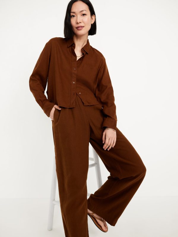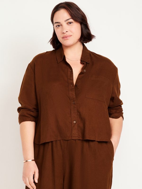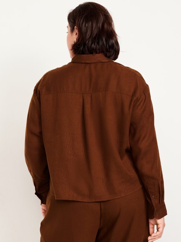 Linen-Blend Button-Down Crop Shirt: spread collar, long sleeves, buttoned cuffs, full-button front, patch chest pocket, #760758