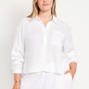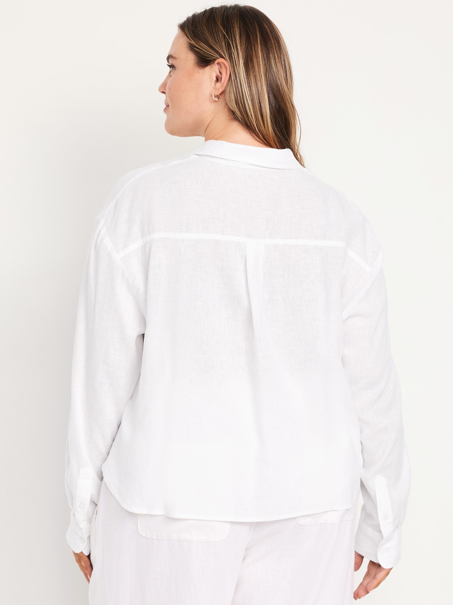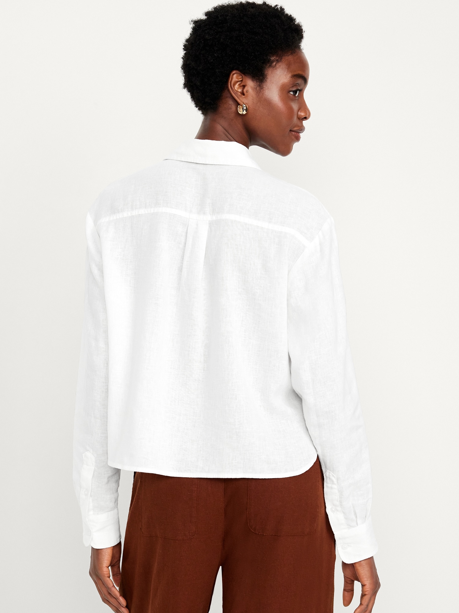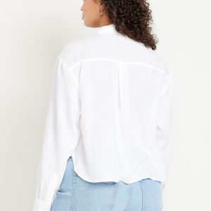 Linen-Blend Button-Down Crop Shirt: spread collar, long sleeves, buttoned cuffs, full-button front, patch chest pocket, #760758