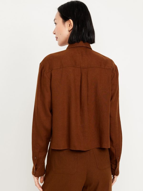 Linen-Blend Button-Down Crop Shirt: spread collar, long sleeves, buttoned cuffs, full-button front, patch chest pocket, #760758