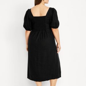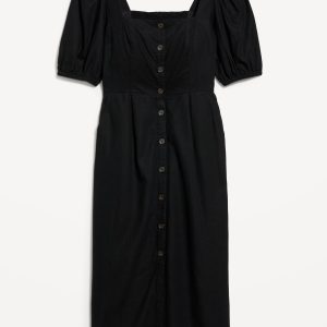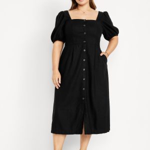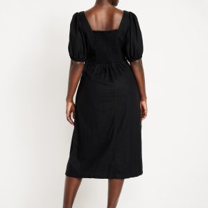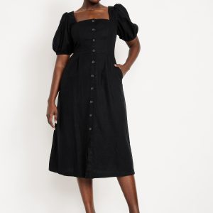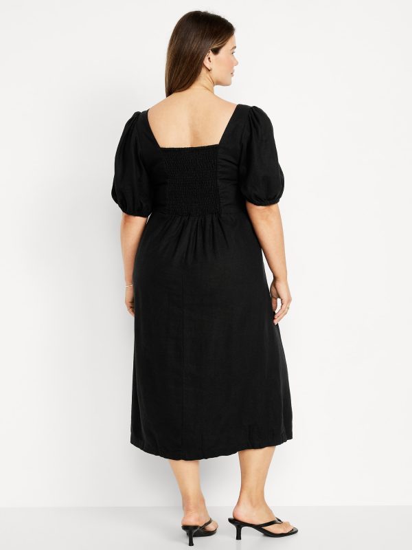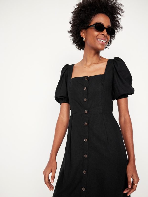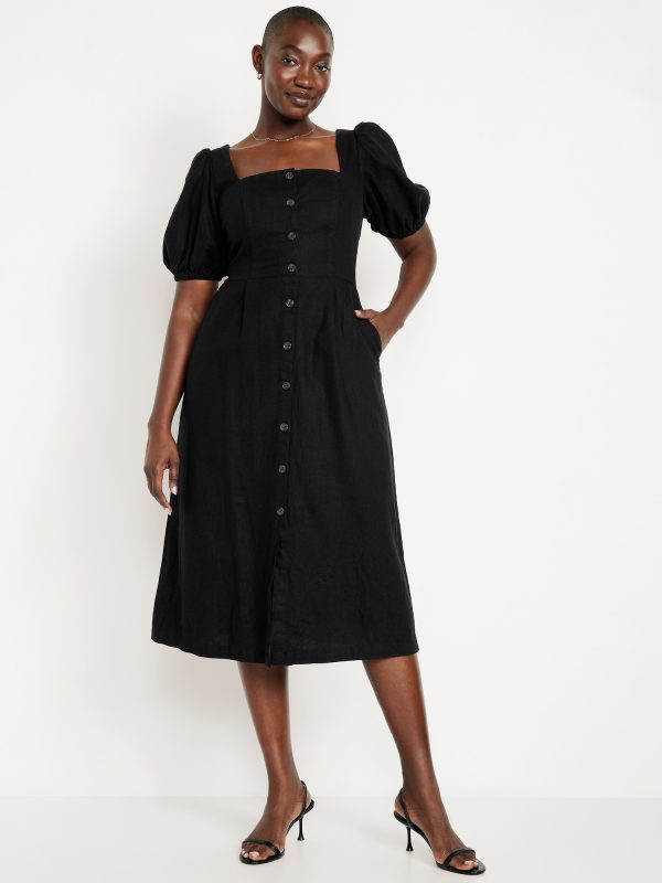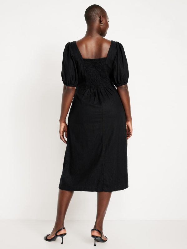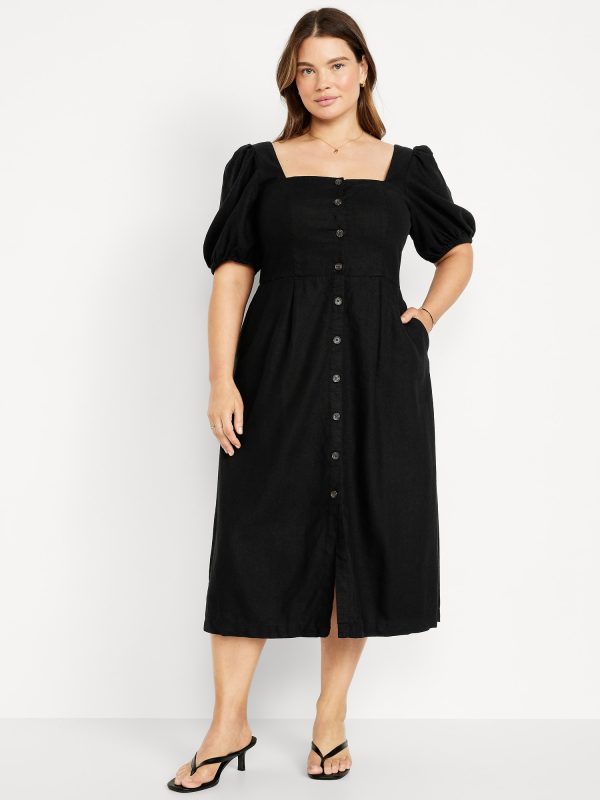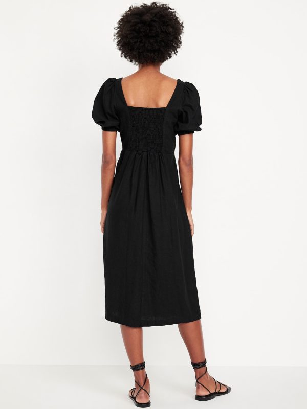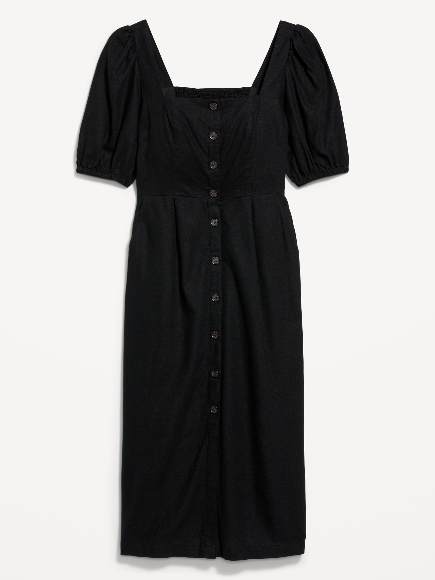 Linen-Blend Button-Front Midi Dress: square neck, short puff sleeves, full-button front, diagonal hip pockets, smocked back, #705471