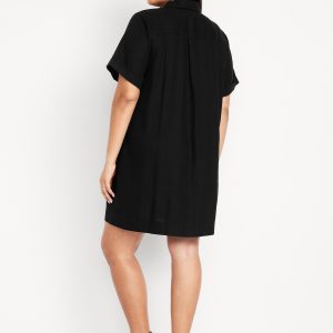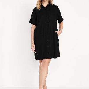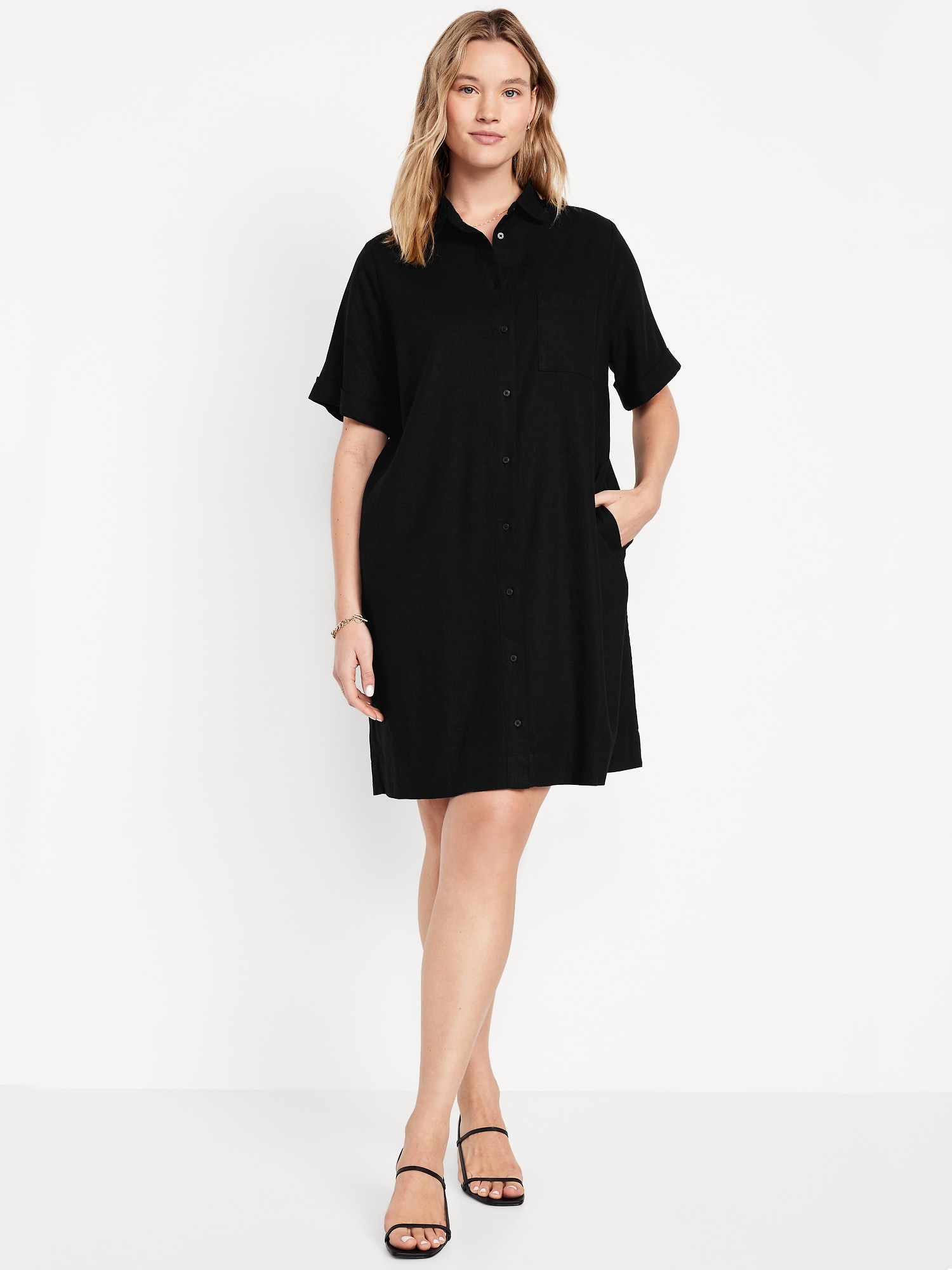 Linen-Blend Shirt Dress: spread collar, short sleeves, full-button front, patch chest pocket, striped print, #766933
