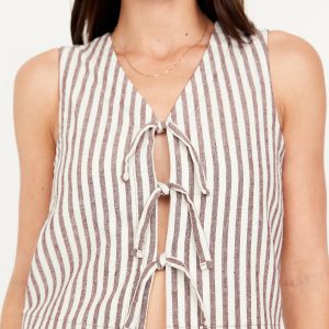 Linen-Blend Tie-Front Vest: v-neck, sleeveless, tie-front accent, #764212