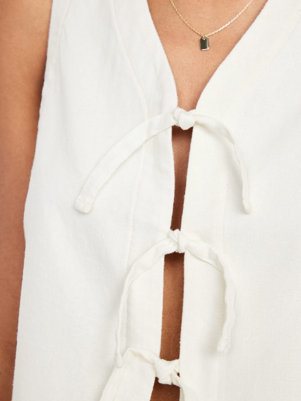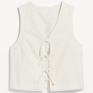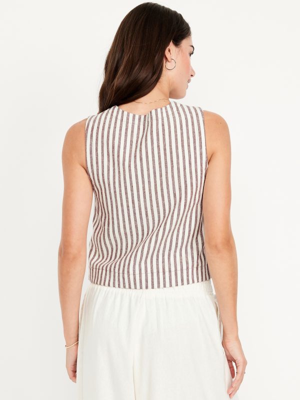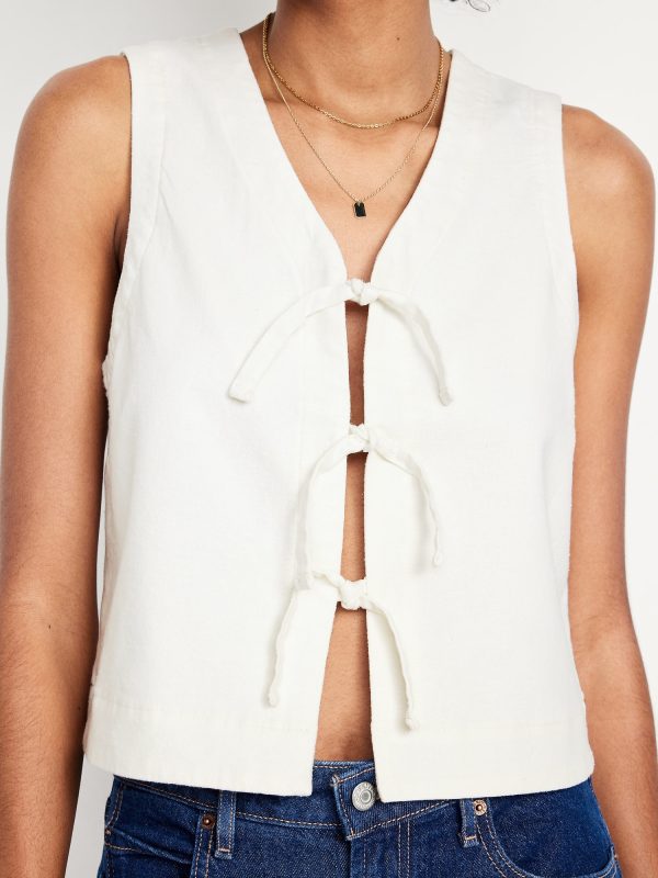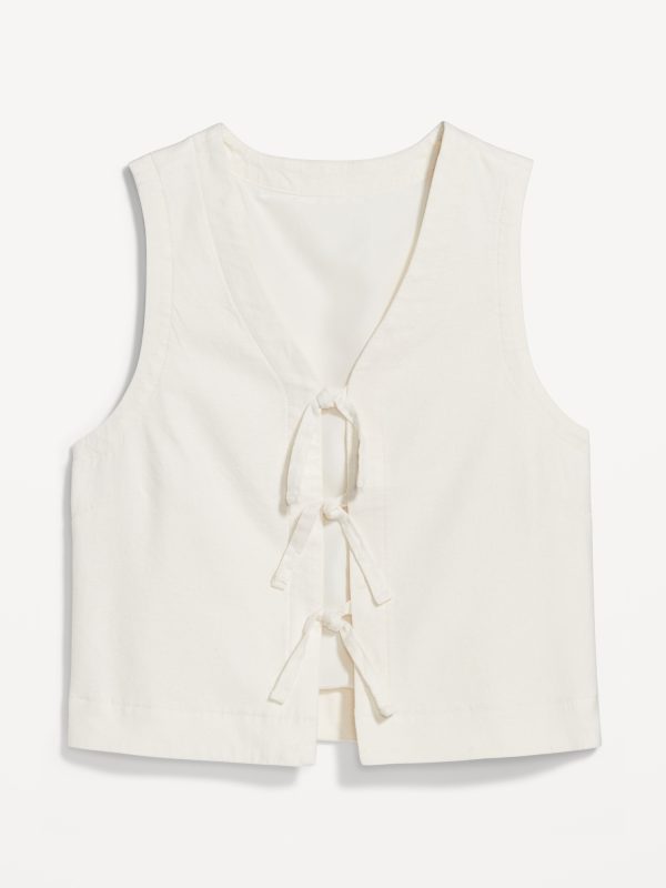 Linen-Blend Tie-Front Vest: v-neck, sleeveless, tie-front accent, #764212