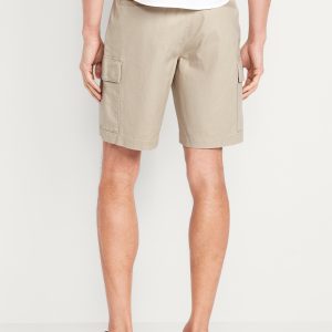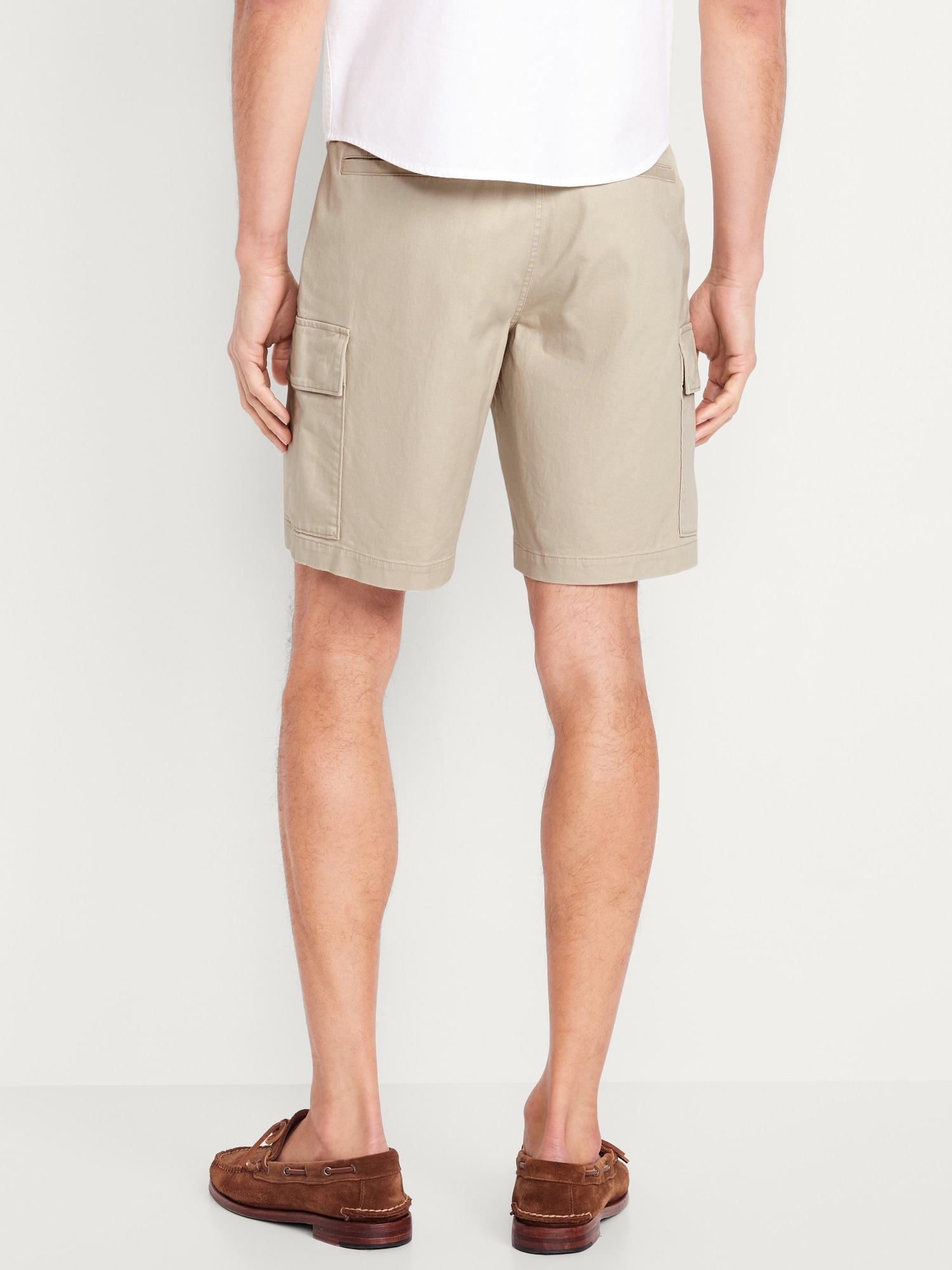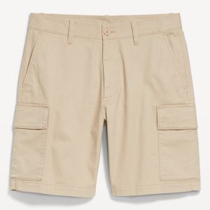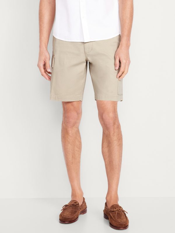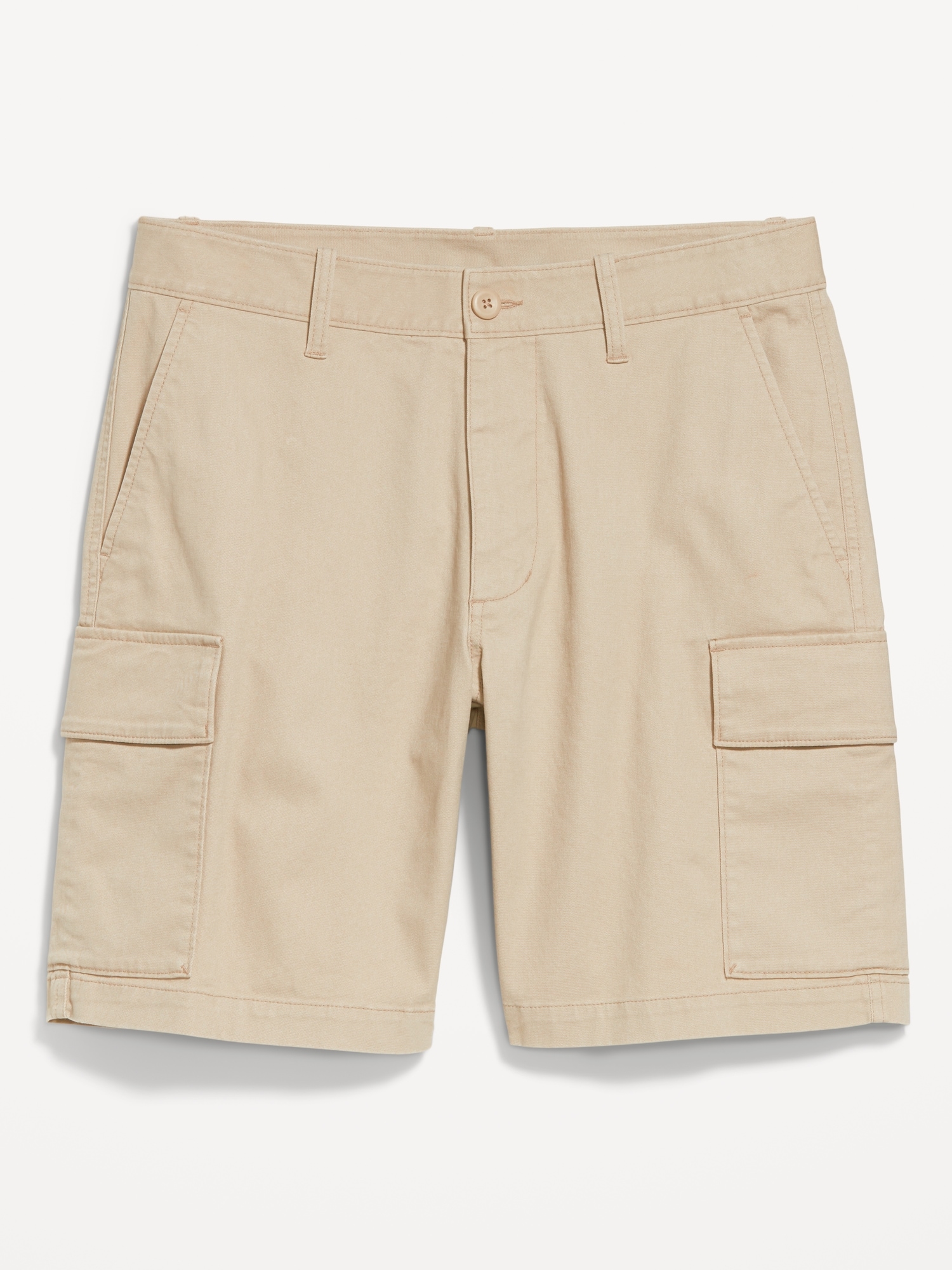 Lived-In Cargo Shorts — 9-inch inseam: button front, belt loops, zip fly, diagonal front pockets, back welt pockets, flap-cargo pockets at thigh, #695513