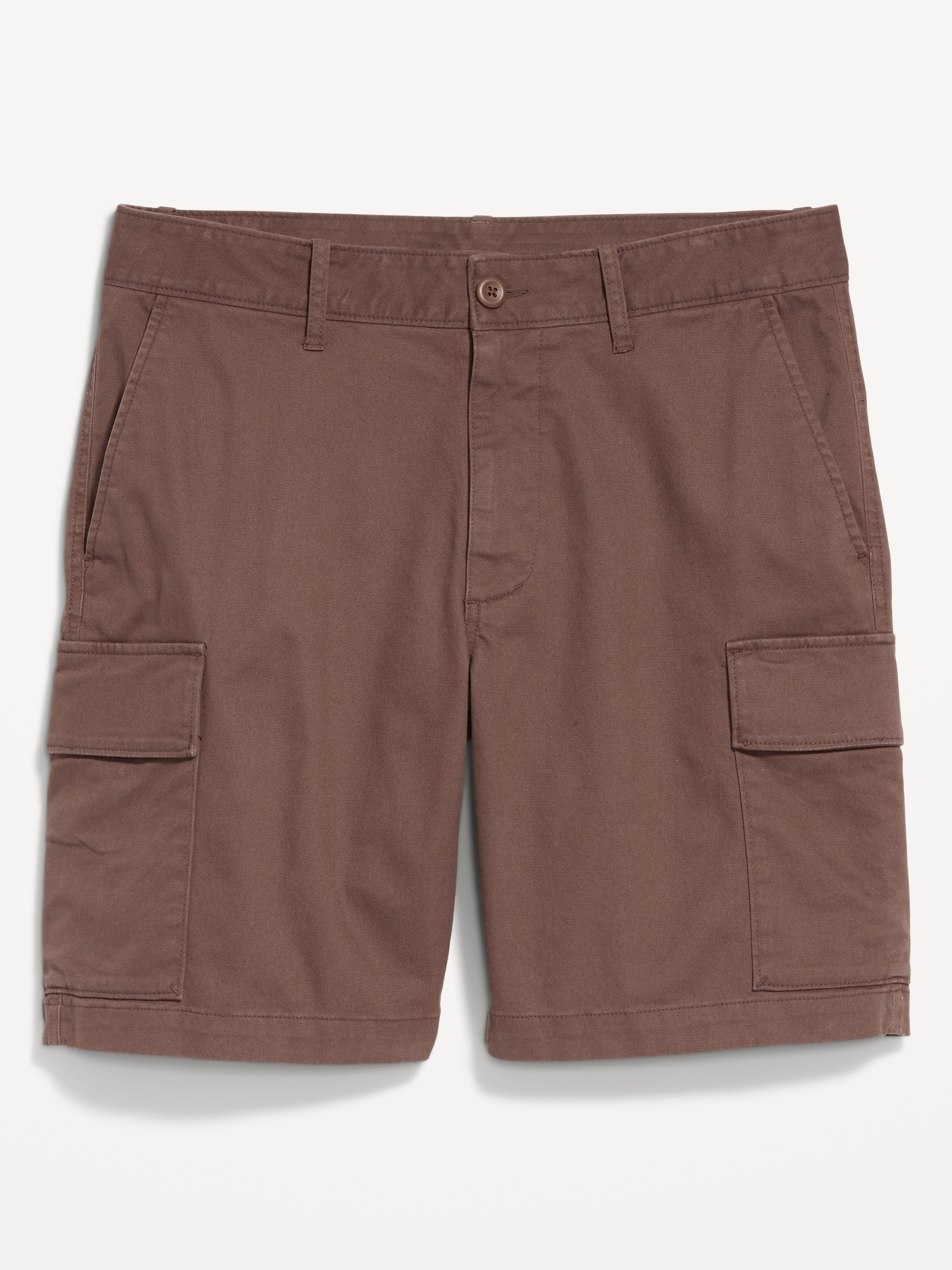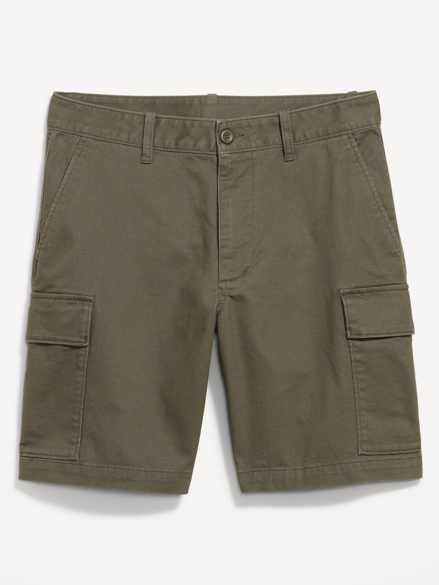 Lived-In Cargo Shorts — 9-inch inseam: button front, belt loops, zip fly, diagonal front pockets, back welt pockets, flap-cargo pockets at thigh, #695513
