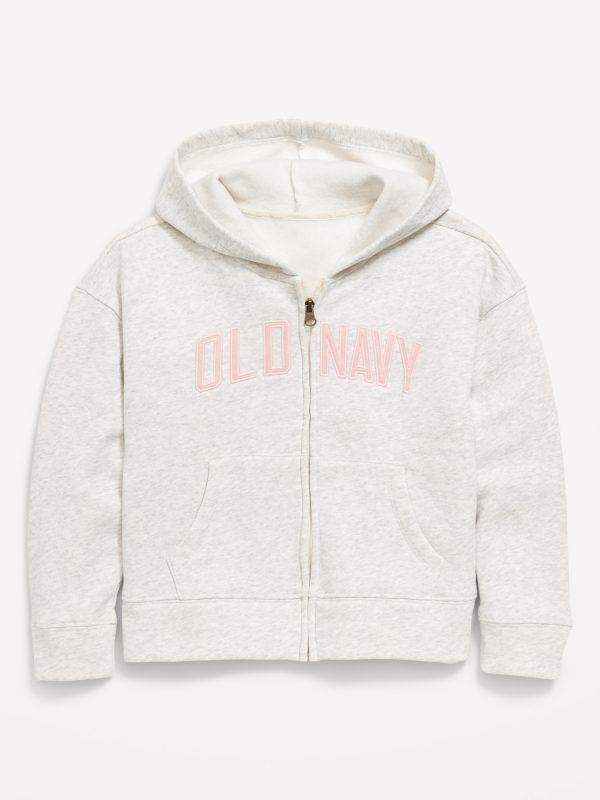 Logo-Graphic Zip Hoodie for Girls: built-in hood, long sleeves, full-length front zipper, embroidered logo graphic, banded hem, #871012