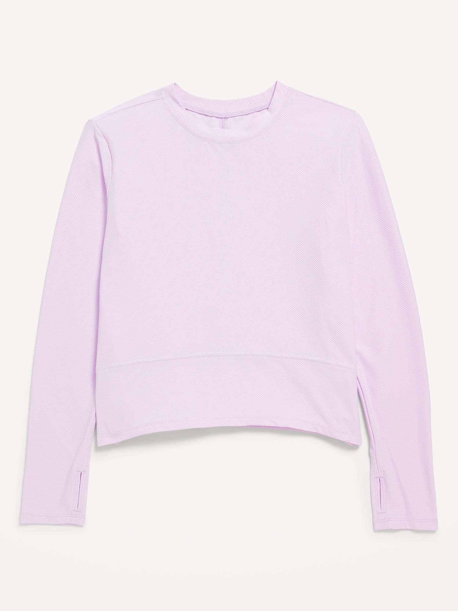 Long-Sleeve Curved-Hem Performance Top for Girls: crew neck, long sleeves, thumbhole slits, curved hem, side slits, #508072