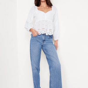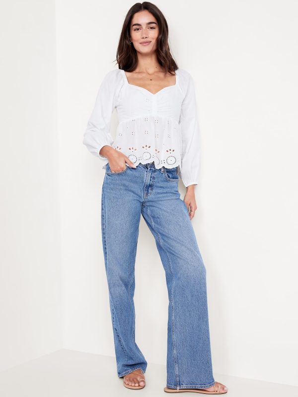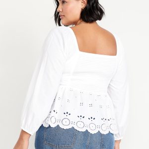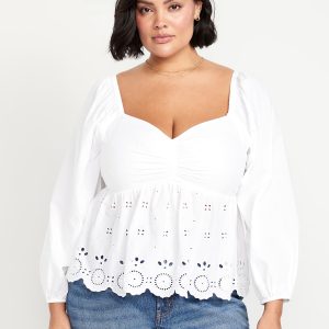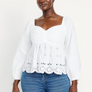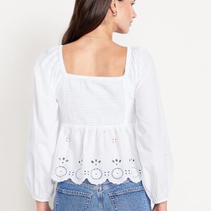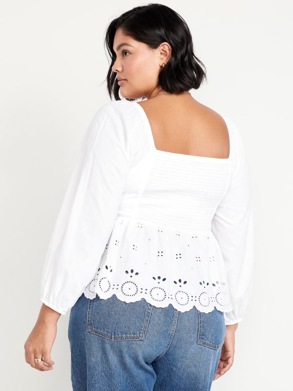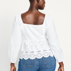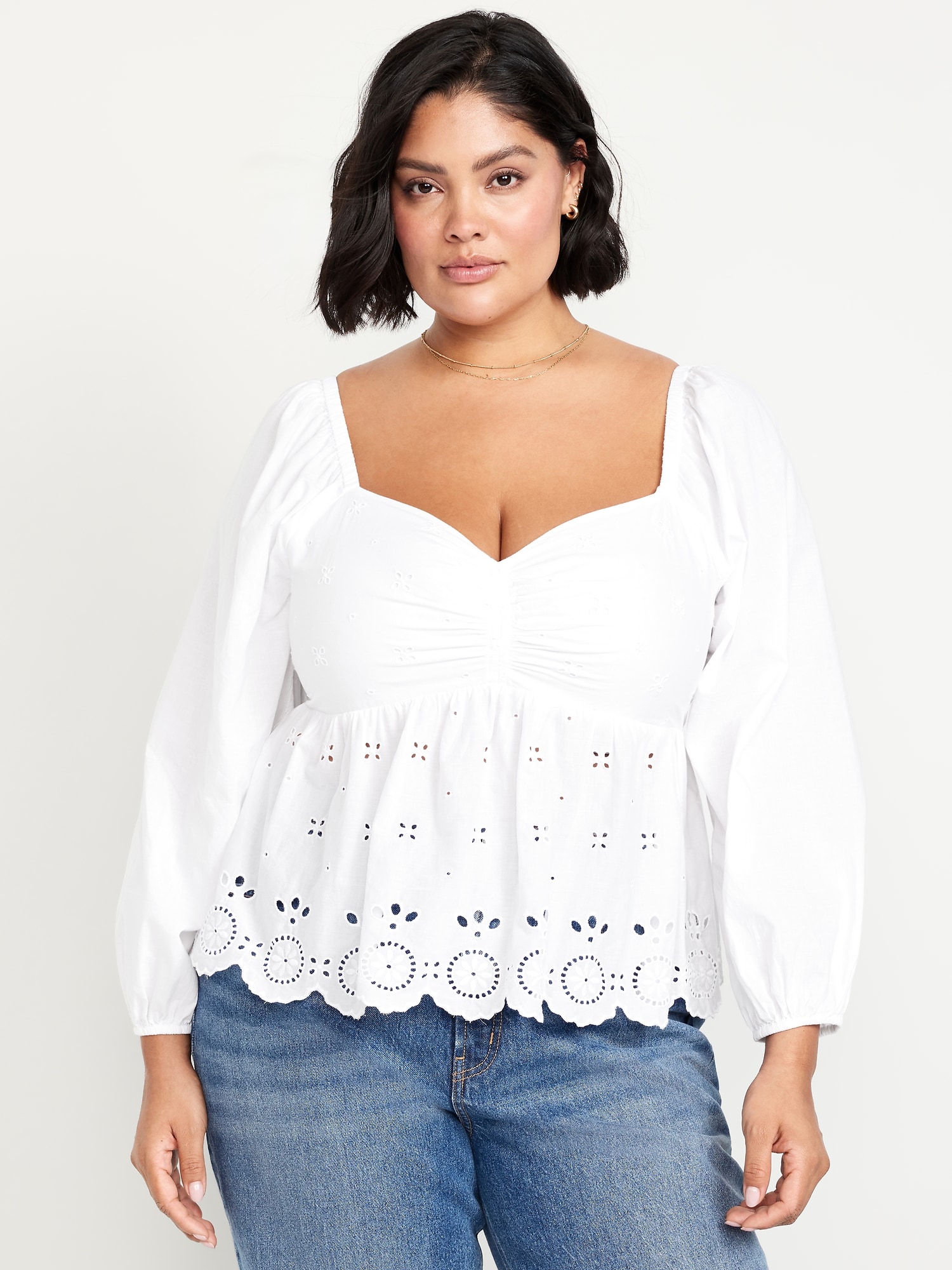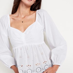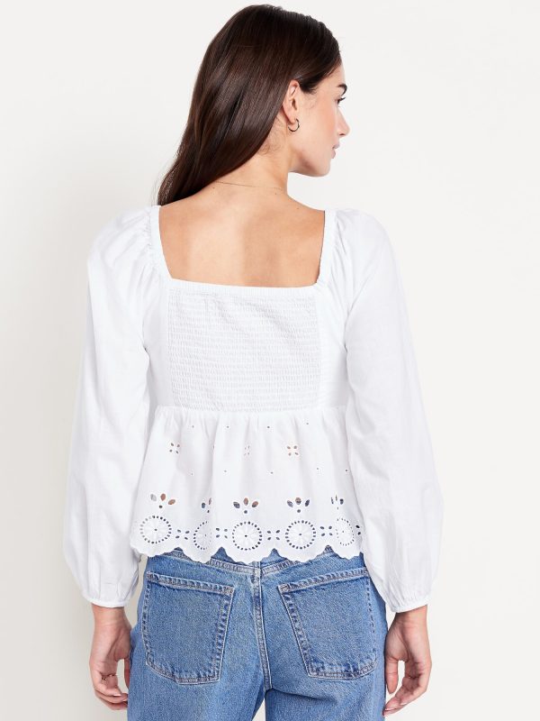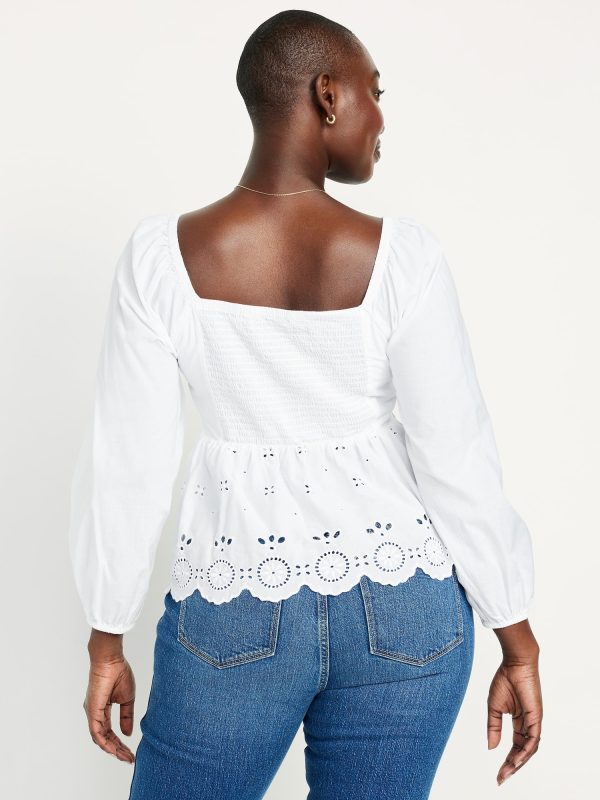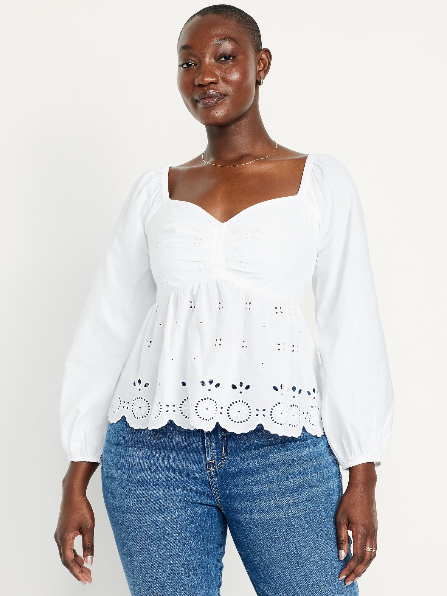 Long-Sleeve Eyelet Top: sweetheart neckline, long sleeves, elastic cuffs, smocked back, striped print, #704104