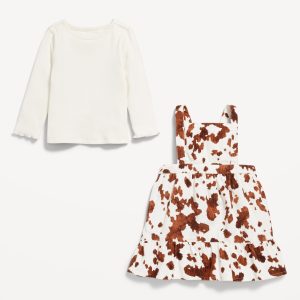 Long-Sleeve Ribbed T-Shirt and Corduroy Dress Set for Baby: round neckline, long sleeves, coordinating dress, wide shoulder straps, embroidered graphic at front, ruffled hem, #802750