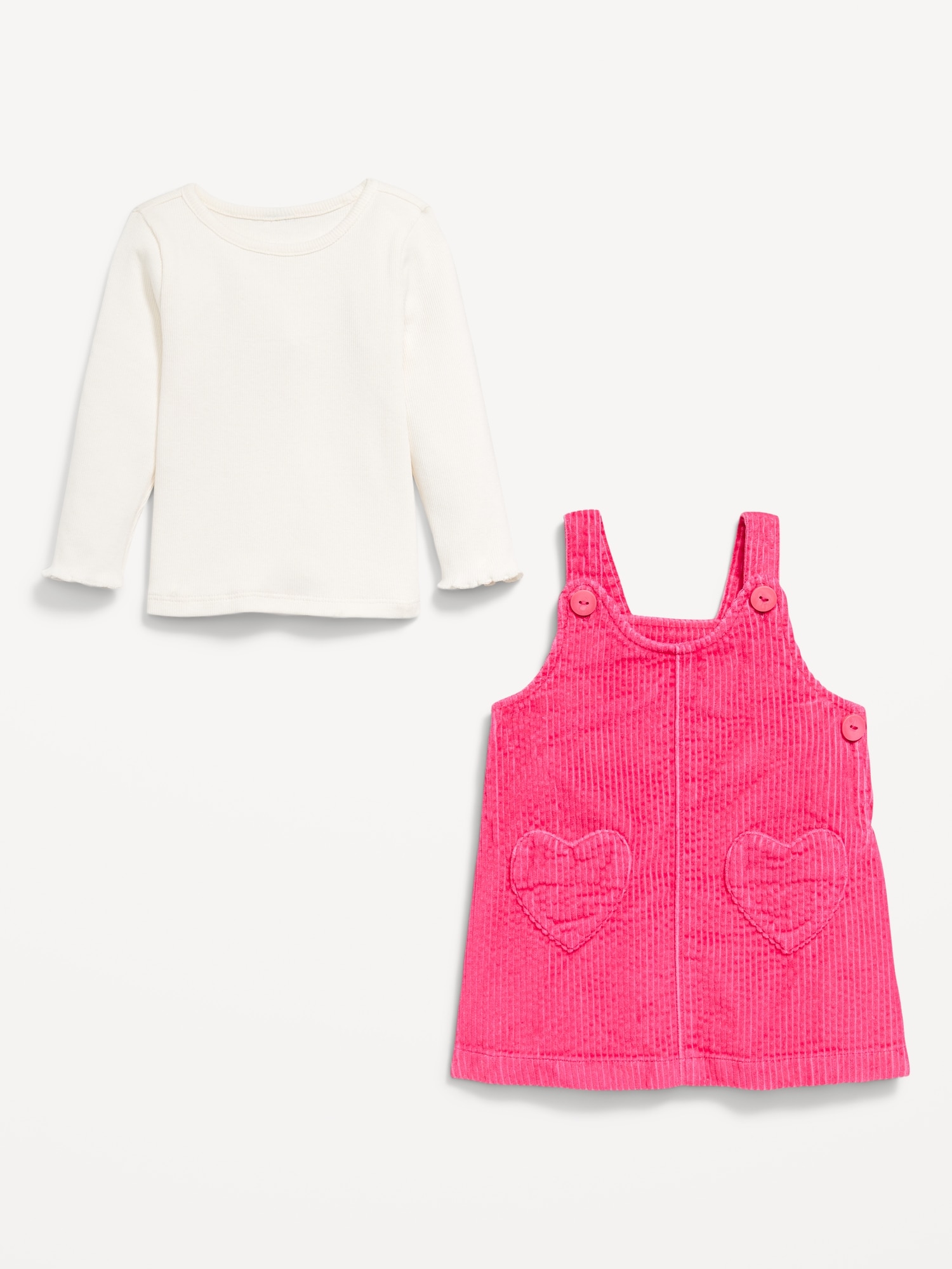 Long-Sleeve Ribbed T-Shirt and Corduroy Dress Set for Baby: round neckline, long sleeves, coordinating dress, buttoned shoulder straps, side buttoned closure, heart patch pockets, #802742