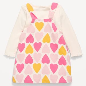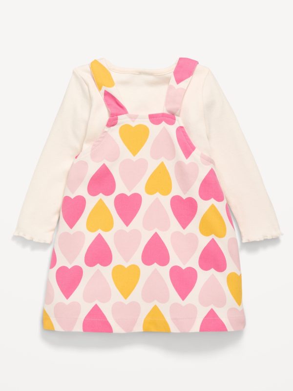 Long-Sleeve Ribbed T-Shirt and Twill Dress Set for Baby: round neckline, long sleeves, coordinating dress, buttoned shoulder straps, side buttoned closure, heart patch pockets, #802742