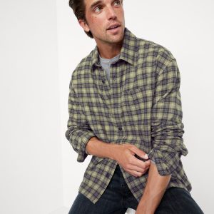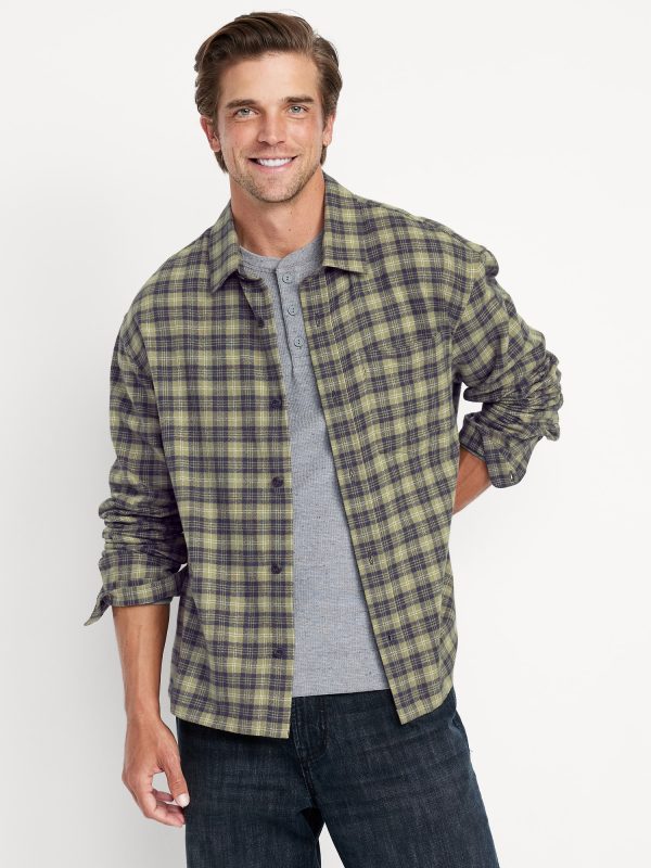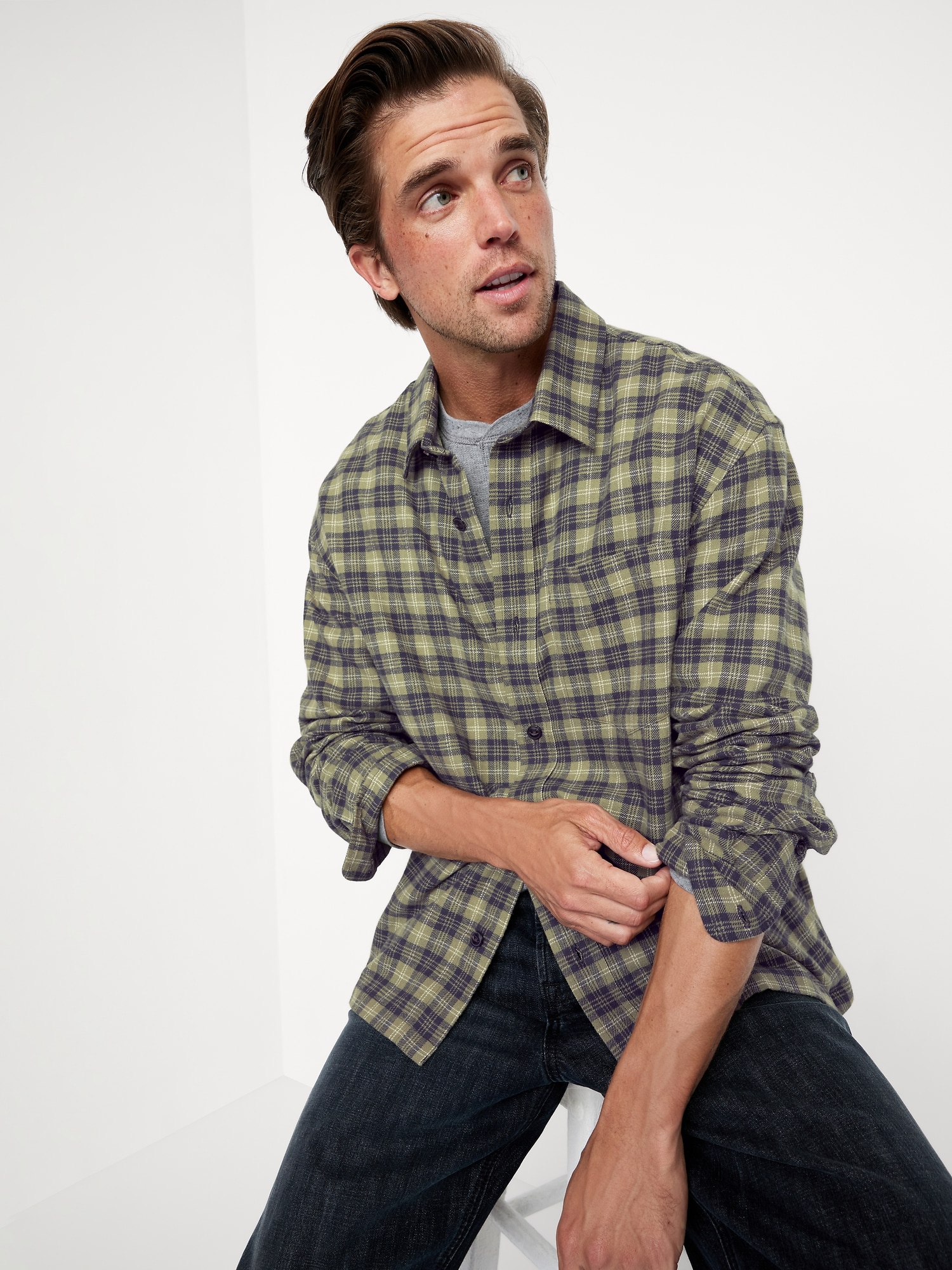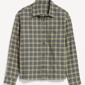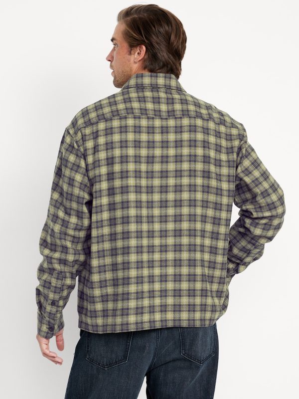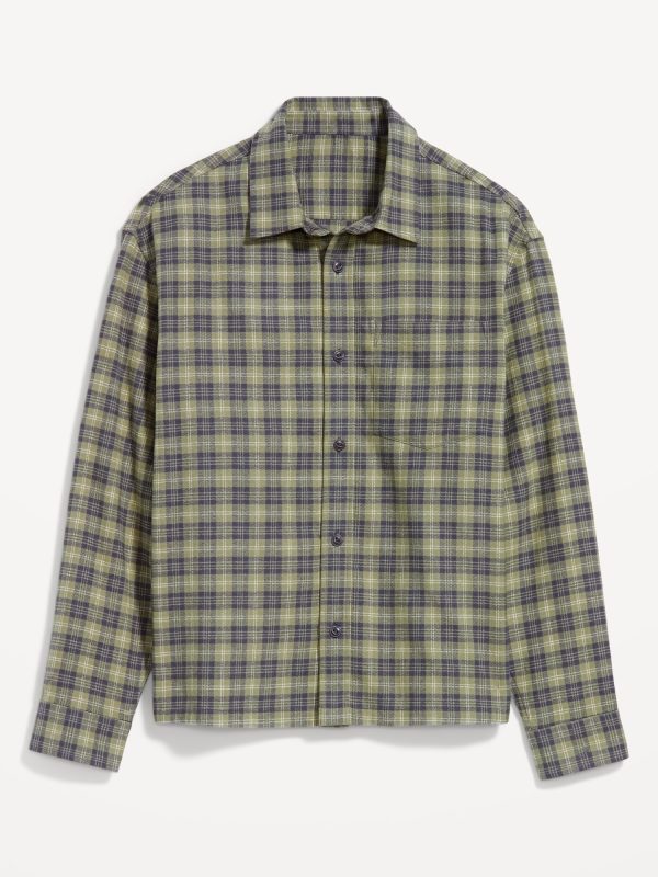 Loose Fit Cropped Plaid Flannel Shirt: spread collar, long sleeves with buttoned cuffs, full-button front, patch chest pocket, plaid print, #805557