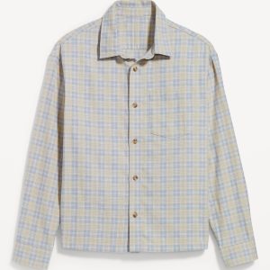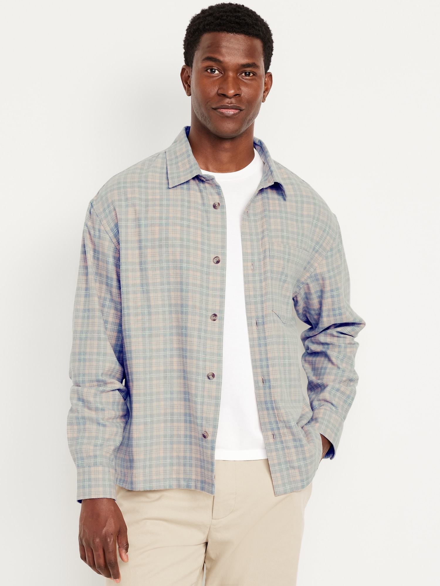 Loose Fit Cropped Plaid Flannel Shirt: spread collar, long sleeves with buttoned cuffs, full-button front, patch chest pocket, plaid print, #805557