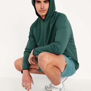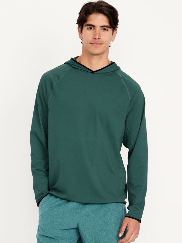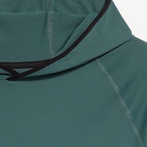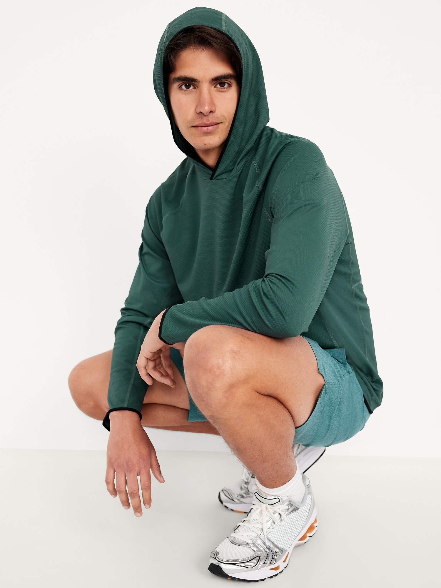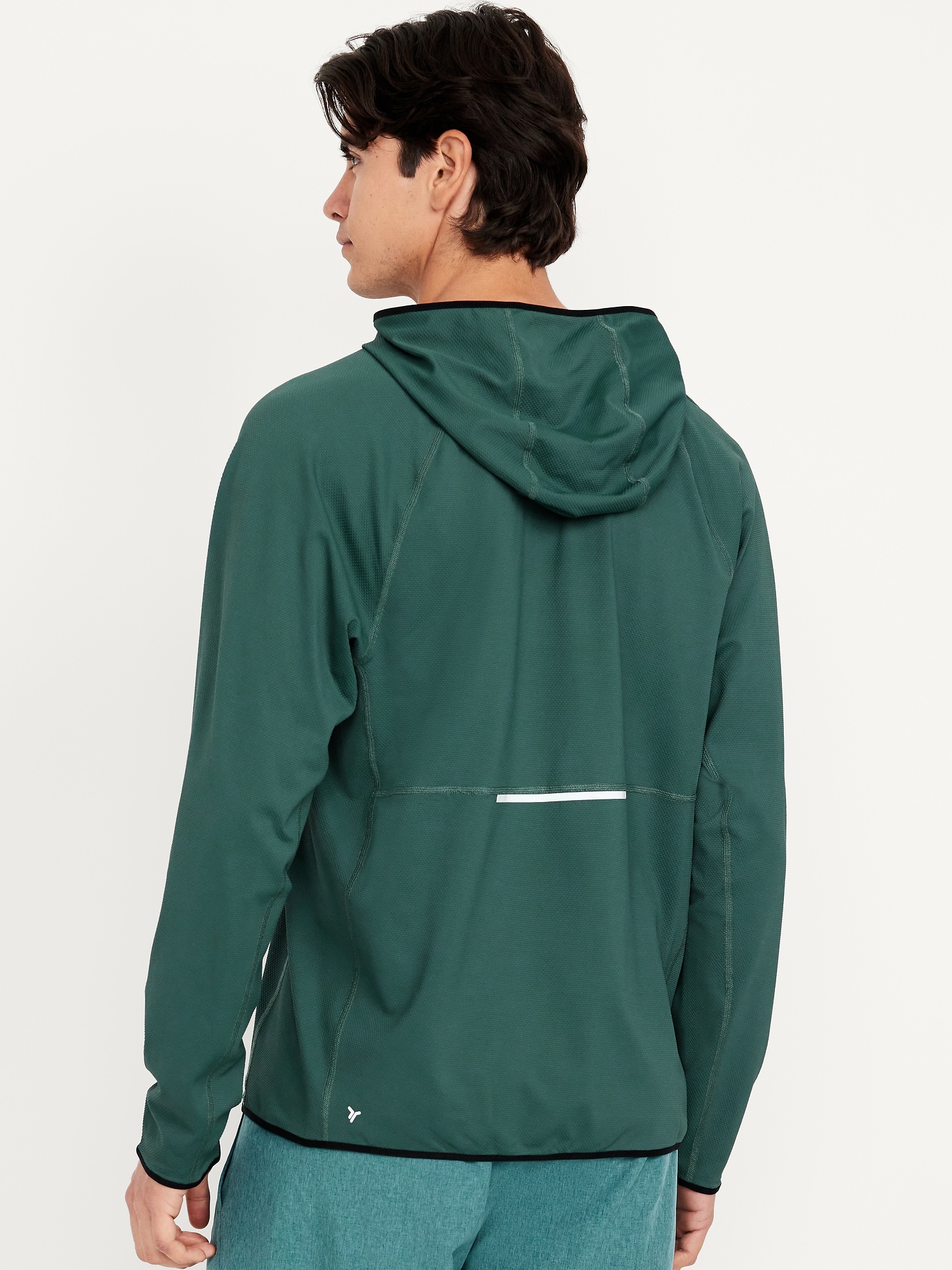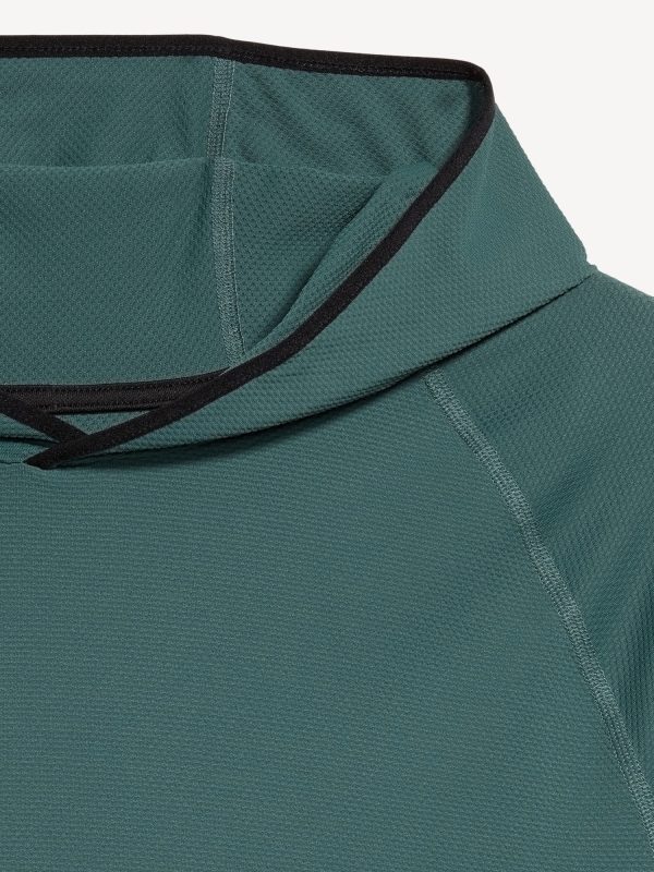 Loose Fit Pullover Run Hoodie: built-in hood, long raglan sleeves, reflective trim at center back, go-dry cool wicks moisture and keeps you cool, breathable, pullover style, #749723