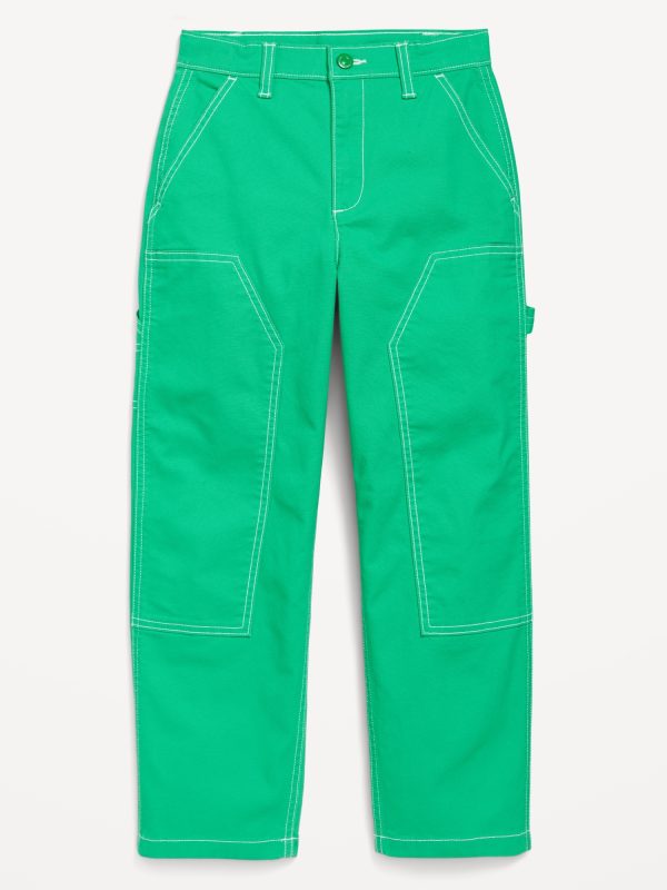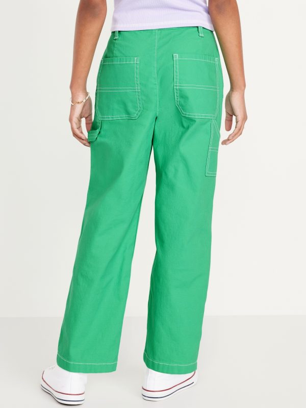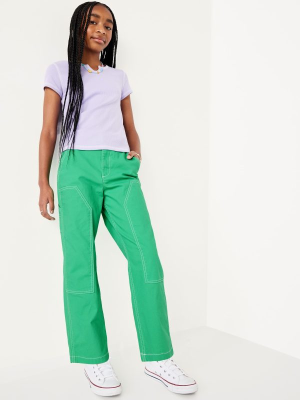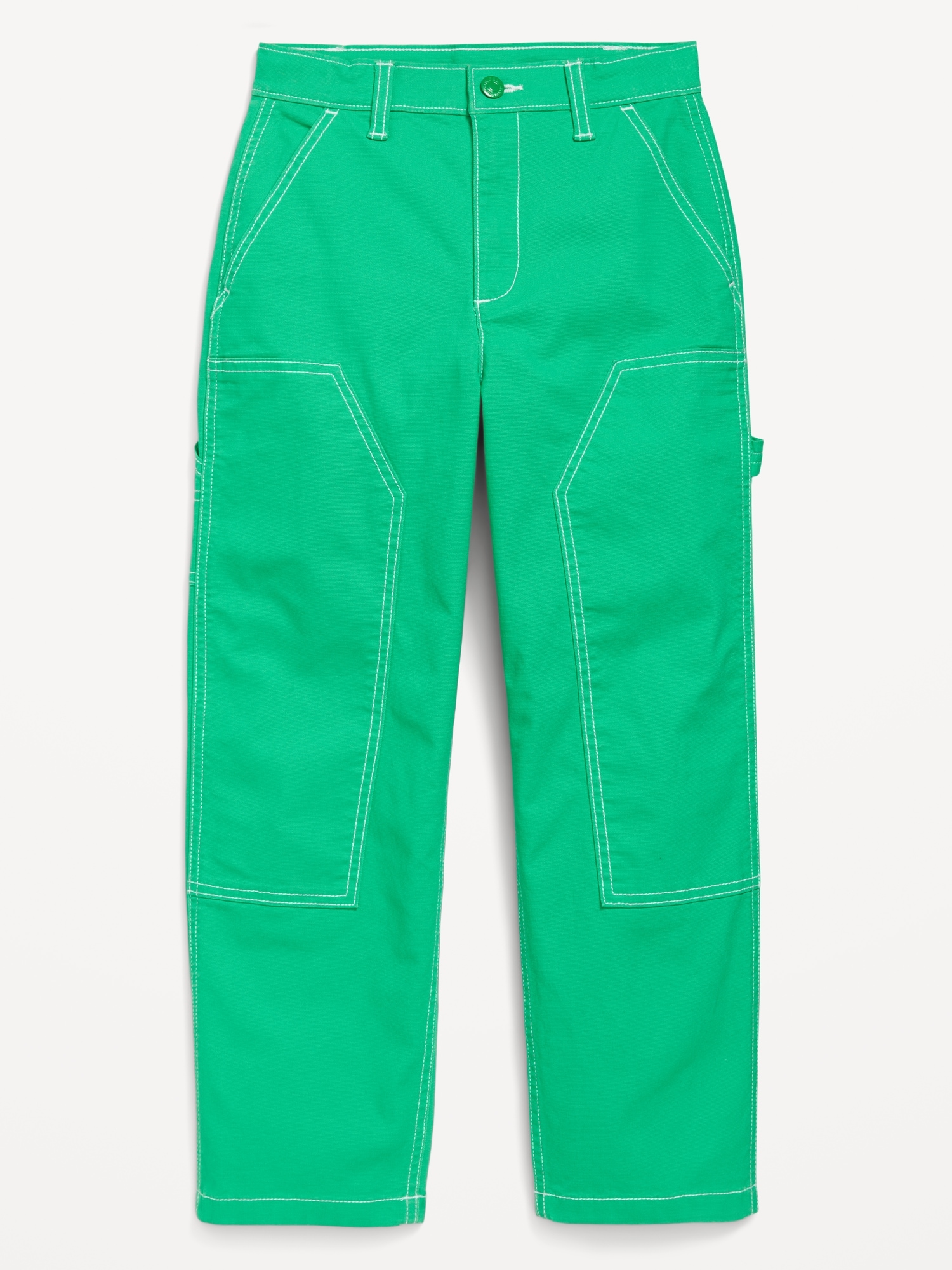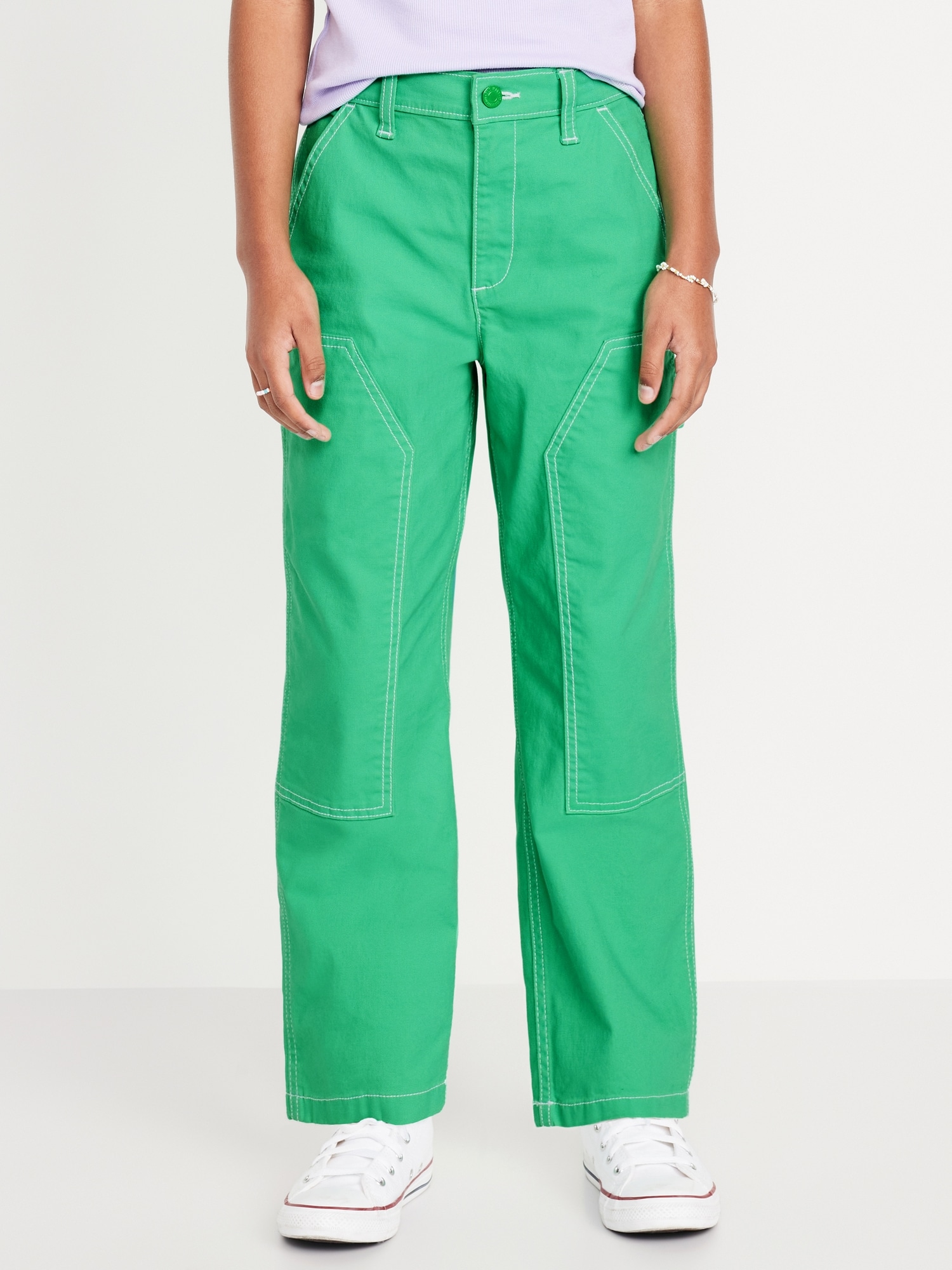 Loose High-Waisted Carpenter Pants for Girls: interior adjustable waistband, sizes 5-8 snap-button closure, sizes 10-20 regular button closure, zip fly, diagonal pockets, utility patch pockets at back, hammer loop at left leg, knee patches at front, #704707
