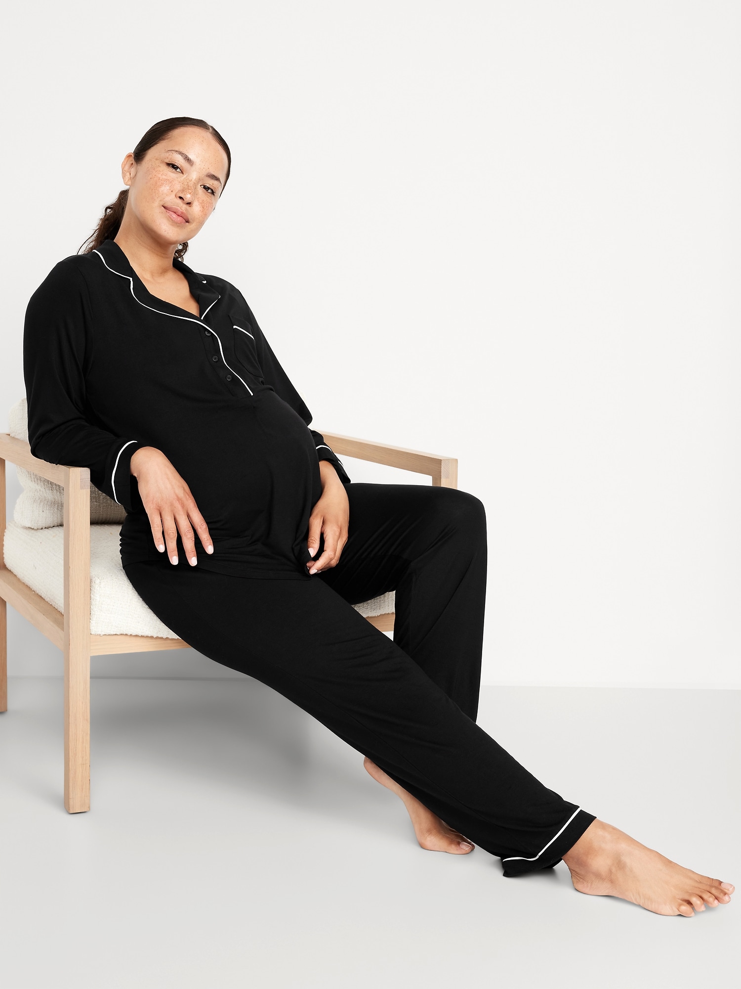 Maternity Classic Pajama Set: set includes pajama shirt and matching pants, notched collar, long sleeves, three-button popover placket, patch chest pocket, foldover-waist pajama pants for pull-on styling, #601460